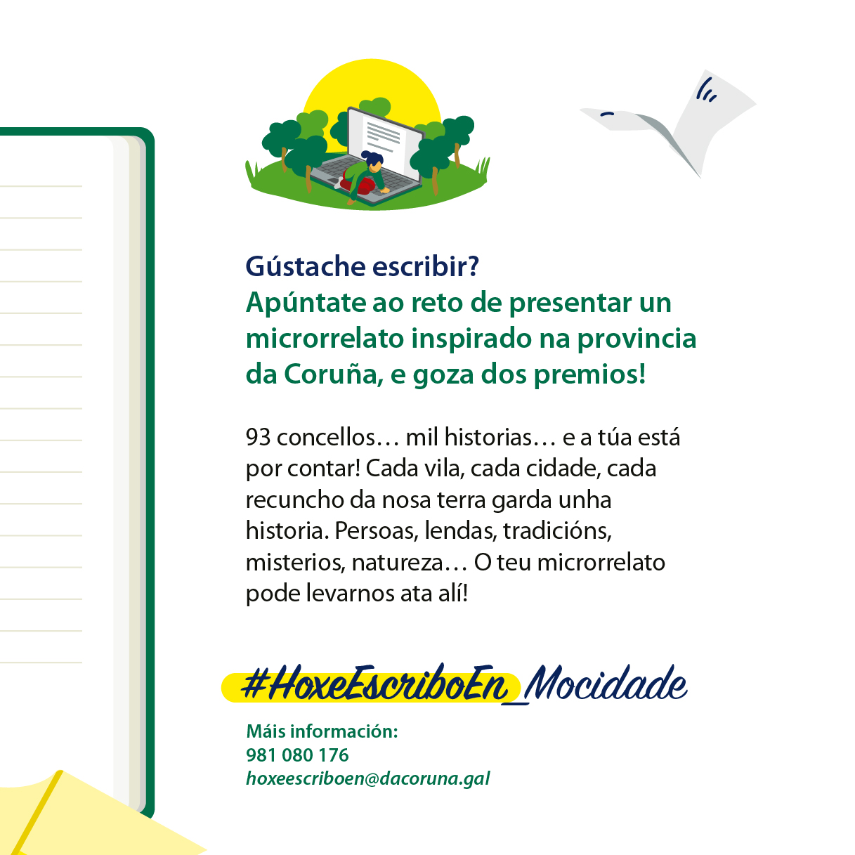 O obxecto do concurso #HoxeEscriboEn _ Mocidade é o fomento do talento creativo, a animación á escritura e á lectura, o impulso do uso do idioma propio entre a mocidade, e a difusión do patrimonio cultural e turístico dos concellos da provincia da Coruña (axudando a sensibilizar sobre o patrimonio cultural, natural e medioambiental de cada un e a importancia de preservalo).