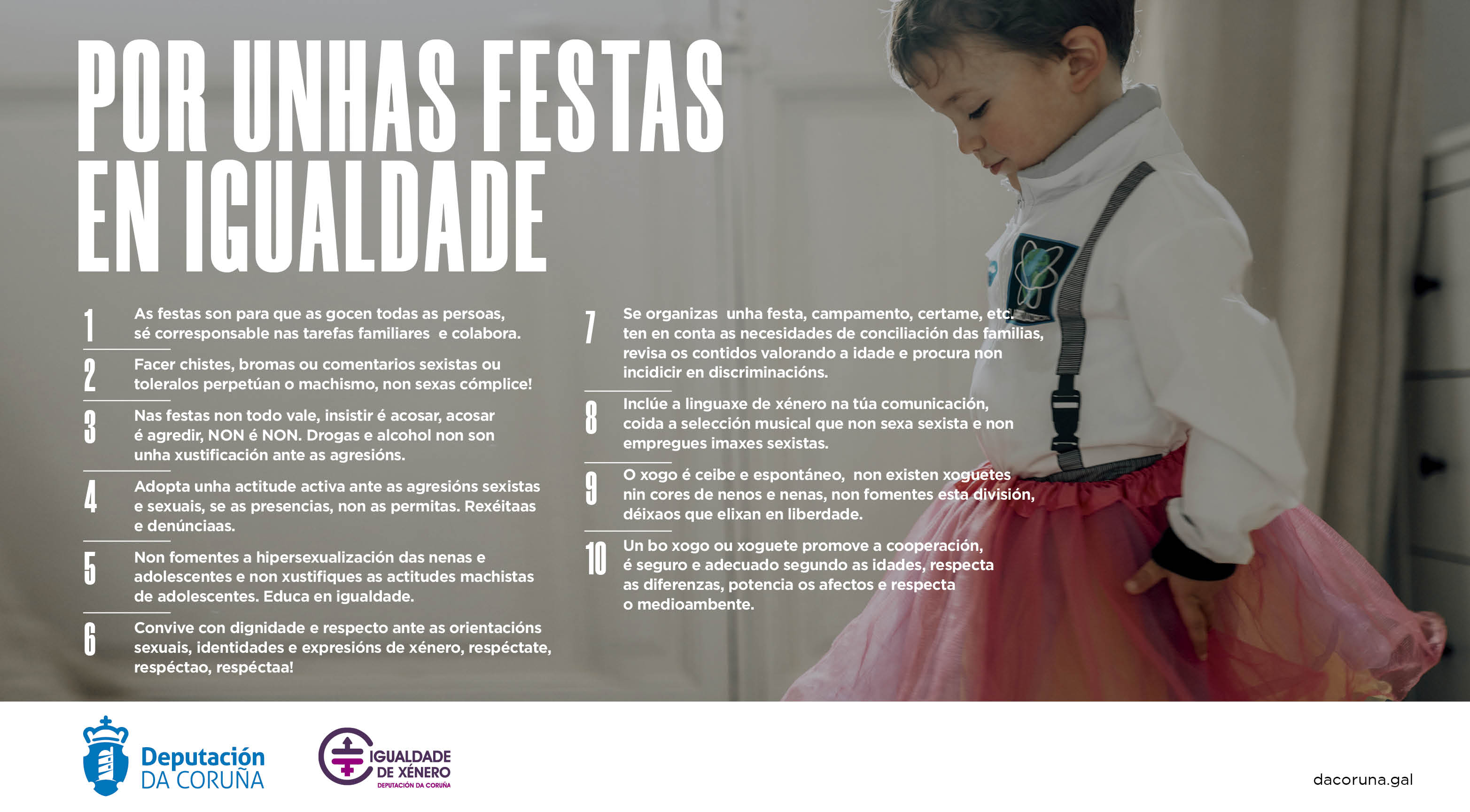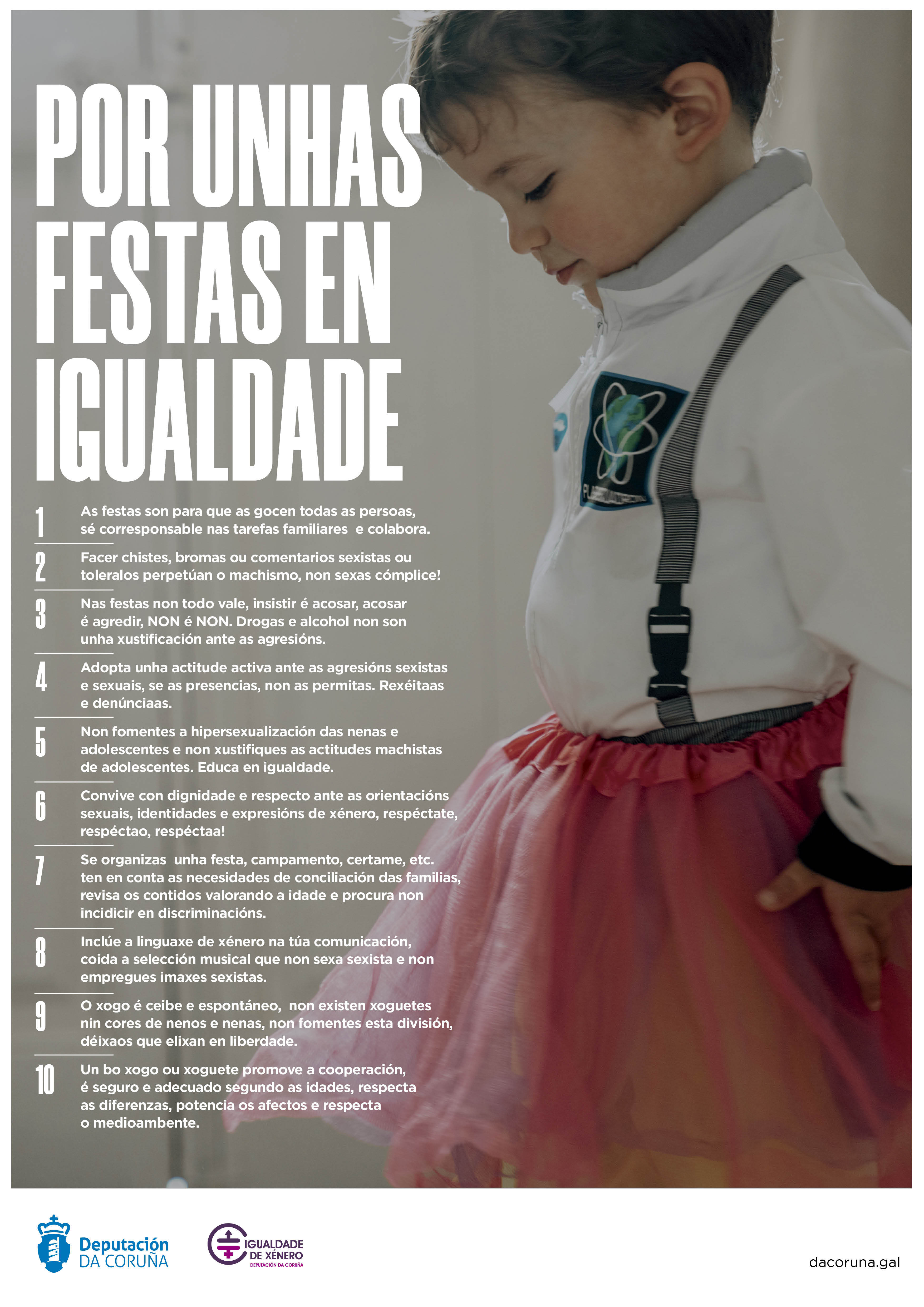 Como sabemos as festas son espazos públicos claves na socialización que están afectados polo patriarcado os roles e estereotipos de xénero e que polo tanto amosan e desenvolven discriminacións e violencias contra as mulleres. Estes espazos constitúense como unha gran oportunidade social para sensibilizar na promoción da igualdade e no rexeitamento contra as violencias machistas, non sexas complice e ten en conta o seguinte decálogo.