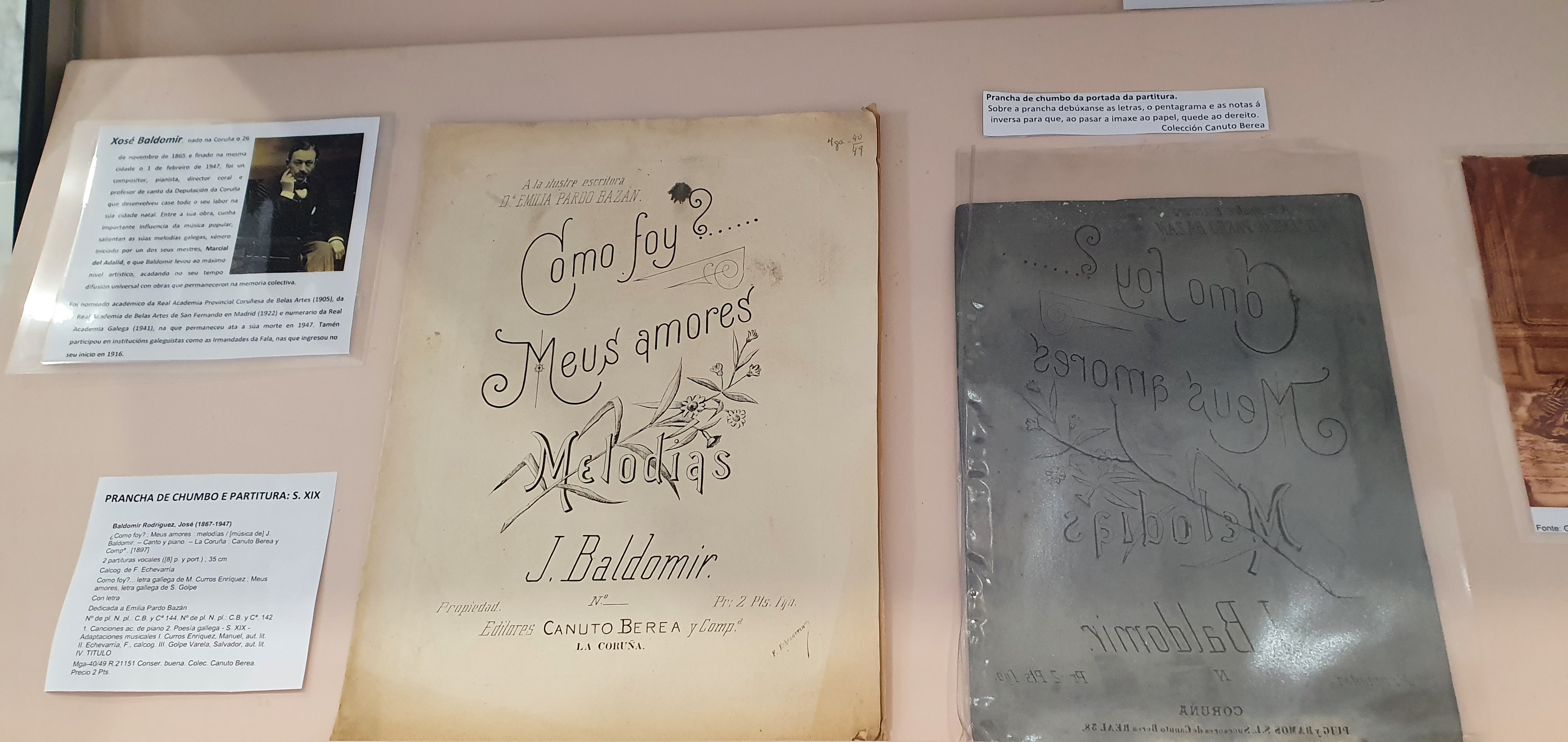 Prancha de chumbo do século XIX para a impresión da portada da partitura de J. Baldomir, dedicada a Emilia Pardo Bazán. Da Colección Canuto Berea[/caption]