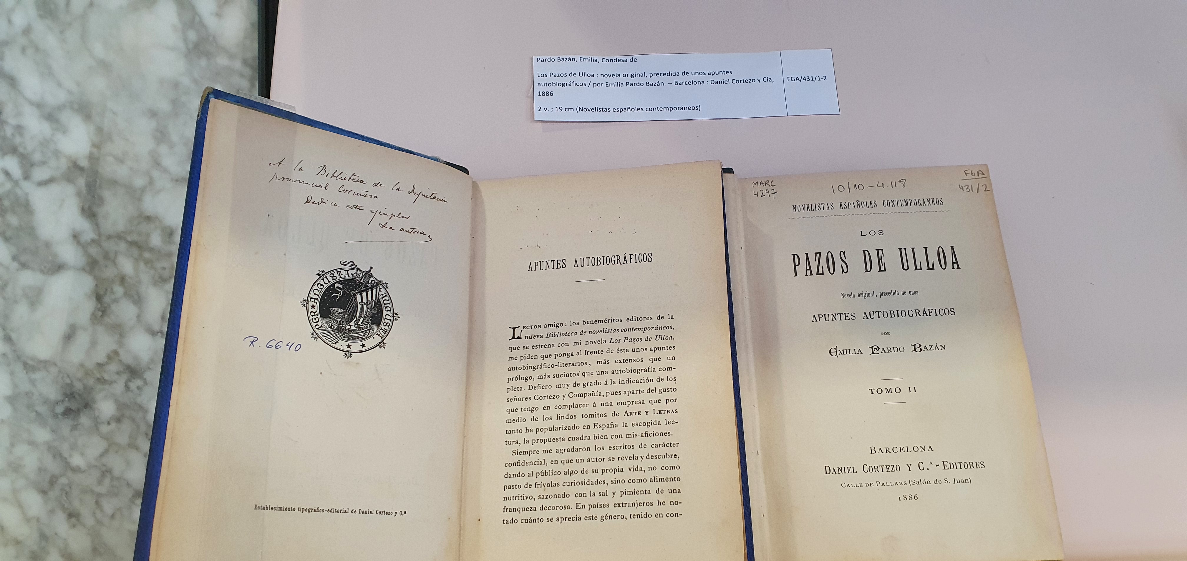 Exemplar de Los Pazos de Ulloa, de 1886, dedicado pola autora á Biblioteca Provincial da Deputación da Coruña[/caption]