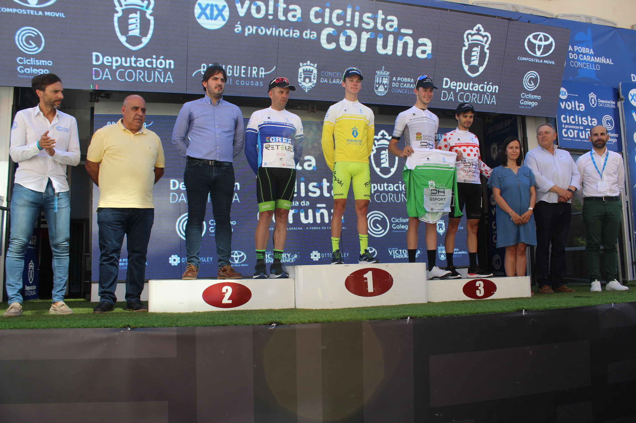 No podio, o presidente da Federación Ciclismo Galego, Juan Carlos Muñiz exerceu de mestre de cerimonias, acompañado por José Manuel López, alcalde da Laracha, Patricia Bello, concelleira de Deportes deste concello, e Jesús Rama e Francisco Boquete, concelleiros de Cerceda de Deportes e Obras, respectivamente. As autoridades nomeadas saudaban aos triunfadores do día con Francesc Bennassar como claro protagonista, xa que á vitoria parcial sumou as camisolas das Metas Volantes- Concello da Laracha e de mellor sub-23-Concello de Ortigueira. Ademais, Rubén Fernández (Retelec-Galicia Cycling Team) mellor galego da rolda, patrocinado polo Concello de Cerceda, Simone Sanò (Drone Hopper- Gsport) líder da montaña- Concello da Pobra do Caramiñal, e a camisola amarela da xeral, o estadounidense Cole Davis (Vigo-Rías Baixas), recibían os aplausos e agarimo de afeccionados e veciños da Laracha.