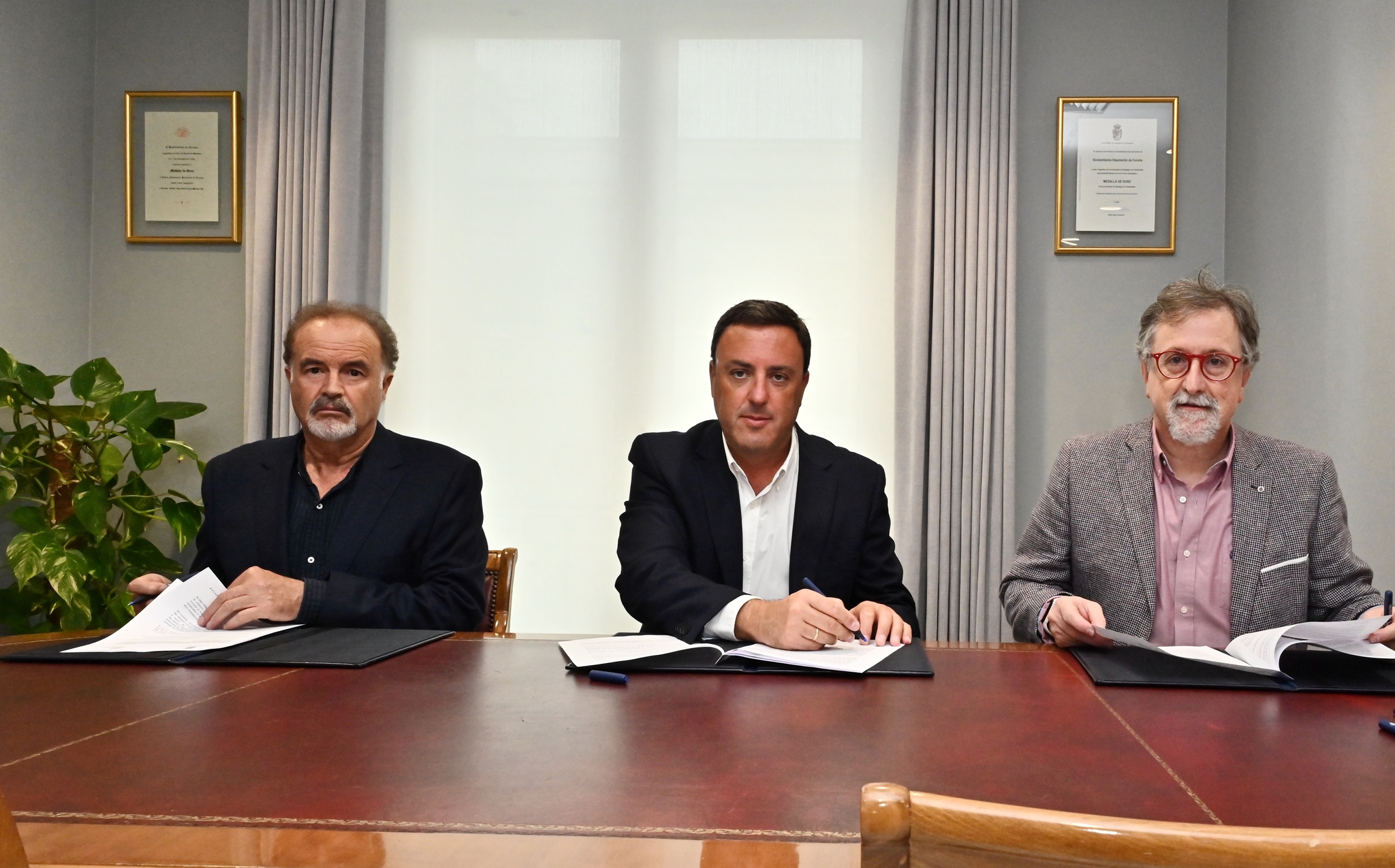 O presidente da Deputación, Valentín González Formoso, o deputado responsable da área de Cultura, Xurxo Couto, e o presidente da Real Academia, Manuel Quintana Martelo, asinaron hoxe o convenio polo que a institución provincial colaborará no financiamento da actividade cunha achega económica de 20.000 euros, que representa o 80% do orzamento total do ciclo.