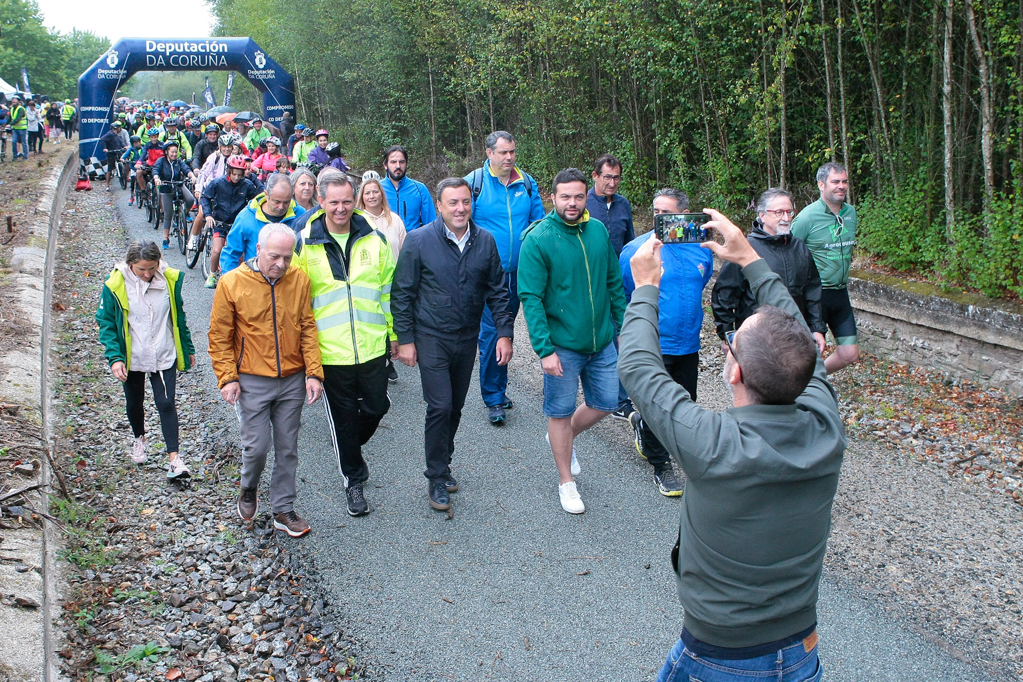 A pesar da chuvia, máis de 600 persoas de todas as idades que participaron, de xeito totalmente gratuíto, na andaina e marcha cicloturista popular organizada para inaugurar o tramo que vai de Cerceda a Oroso da Vía Verde.