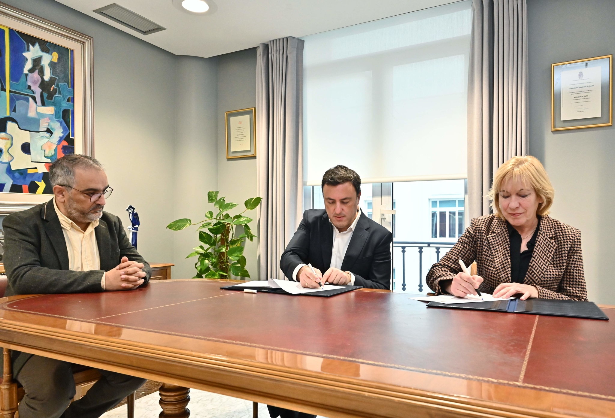 O presidente da Deputación da Coruña, Valentín González Formoso, e a alcaldesa do Concello de Trazo, Josefina Suárez, asinaron hoxe un novo convenio para financiar a reparación das estradas municipais afectadas polos desvíos de tráfico durante as obras DP-7804 para construír unha ponte sobre o rego Gatofero. Ao acto asistiu tamén o deputado de Patrimonio e Contratación, Xose Lois Penas.