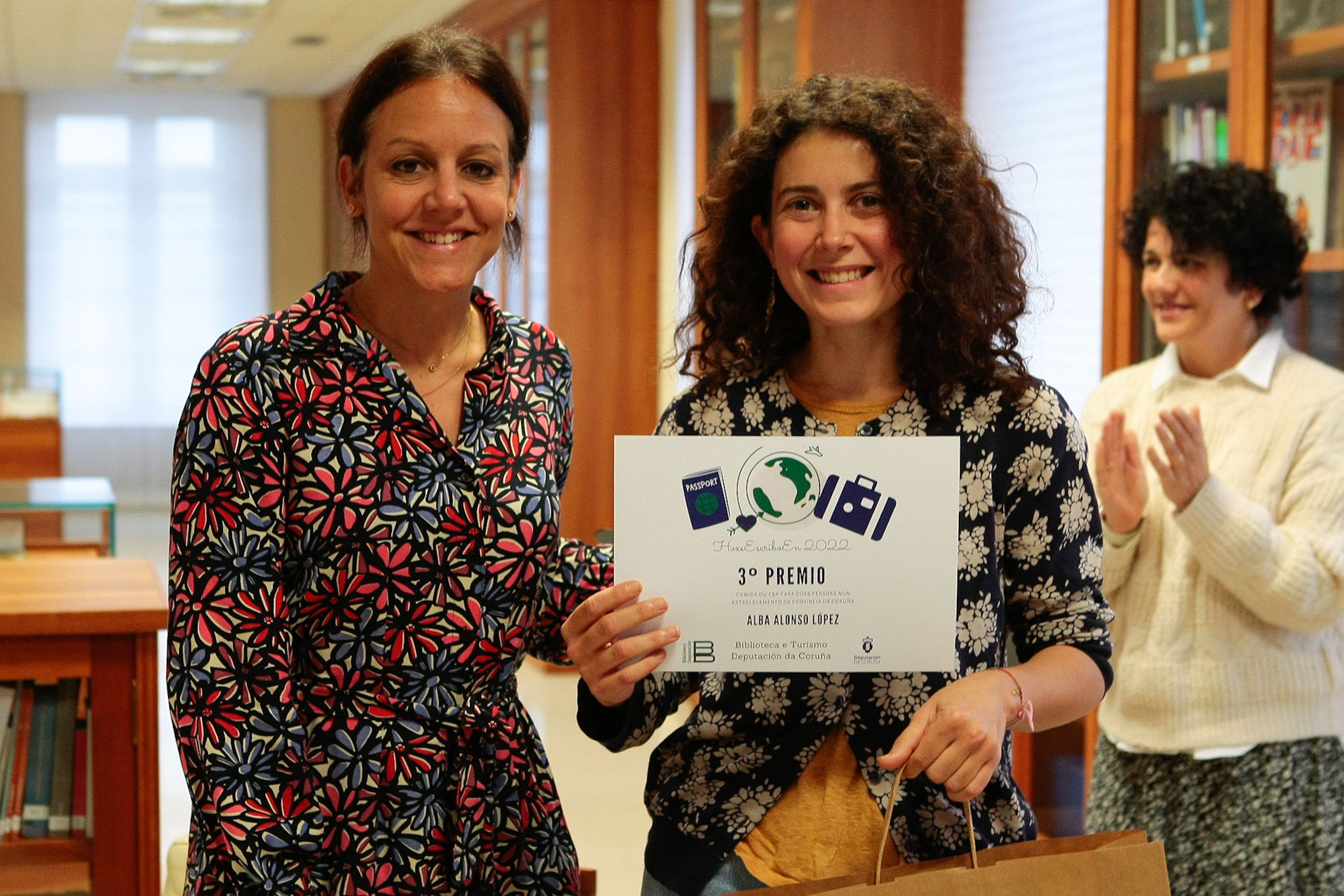 As tres gañadoras do certame #hoxeescriboen do ano 2022 recolleron esta mañá na Biblioteca provincial os seus respectivos galardóns. Trátase de Alba Sánchez Ares, gañadora do primeiro premio polo relato 'Balea Negra' referido ao Concello de Camariñas; de Isabel María Bernal Gándara, gañadora do segundo premio, polo relato 'A Dama de Castro de Betanzos' referido ao Concello de Betanzos; e de Alba Alonso López, gañadora do terceiro premio, polo relato "Escuridade" referido ao Concello de Pontedeume.