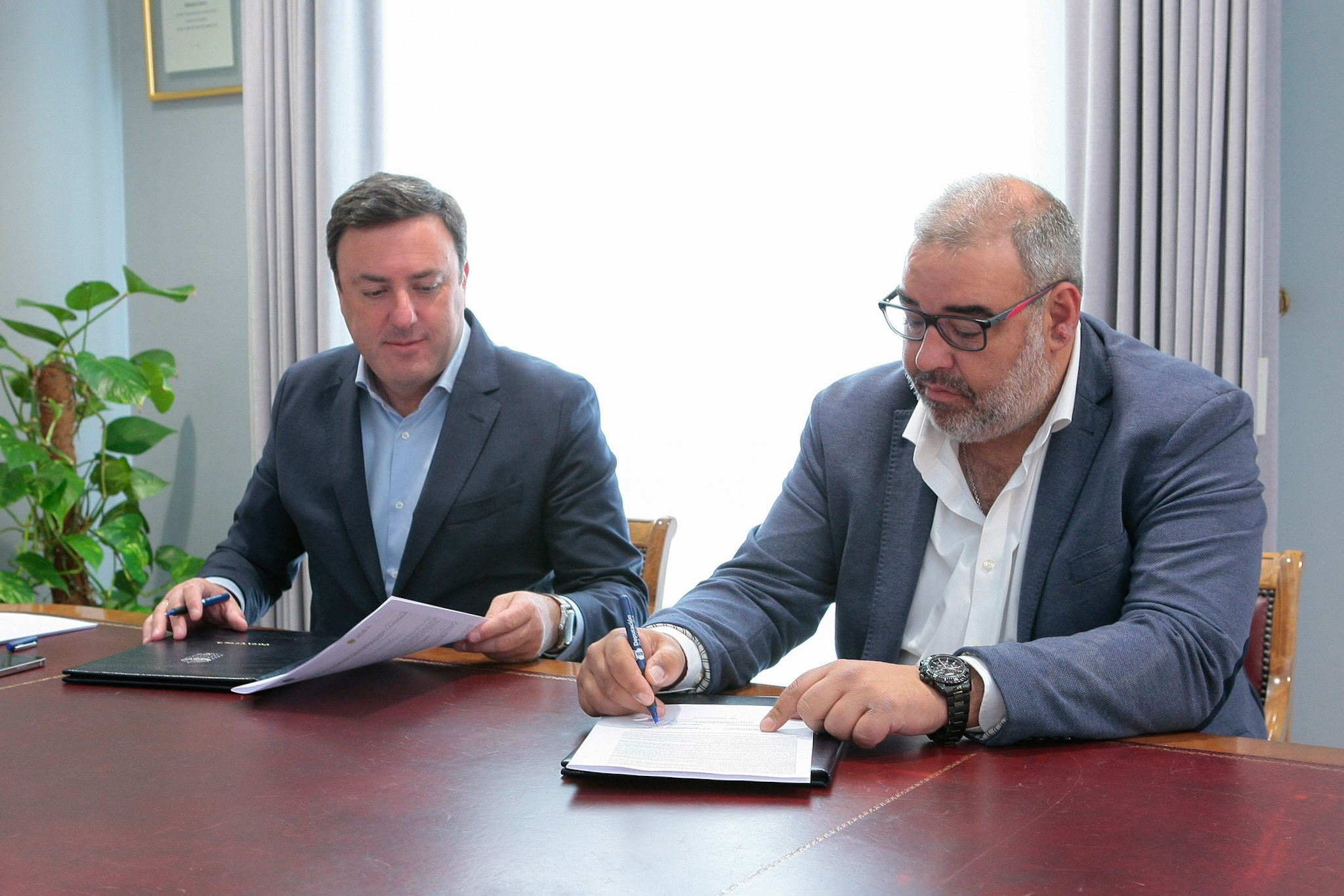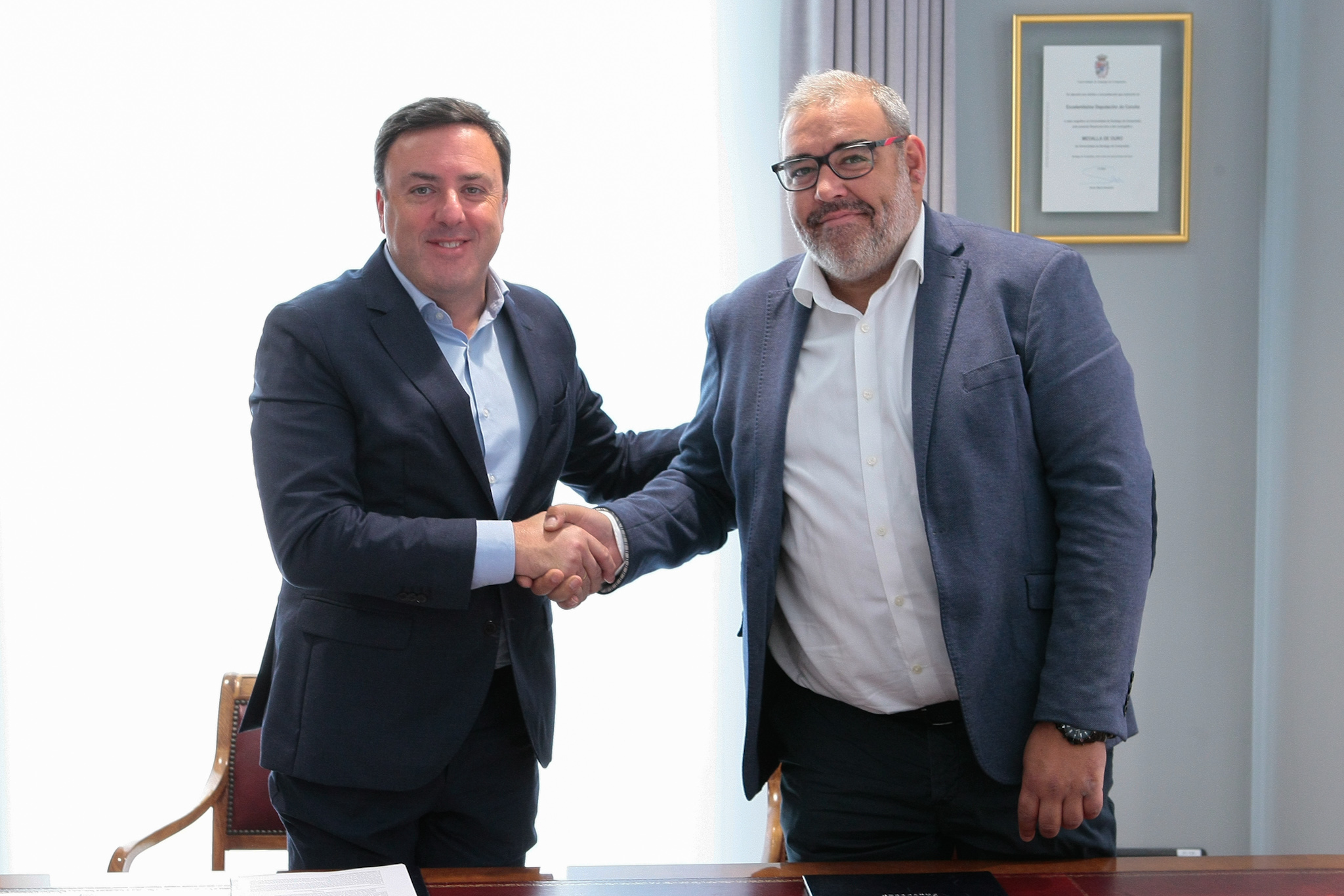 O presidente da Deputación da Coruña, Valentín González Formoso, e o alcalde de Sobrado, Lisardo Santos, asinaron esta mañá o convenio de colaboración para cofinanciar as obras de mellora da capa de rodadura en varios camiños e pistas do Concello.
