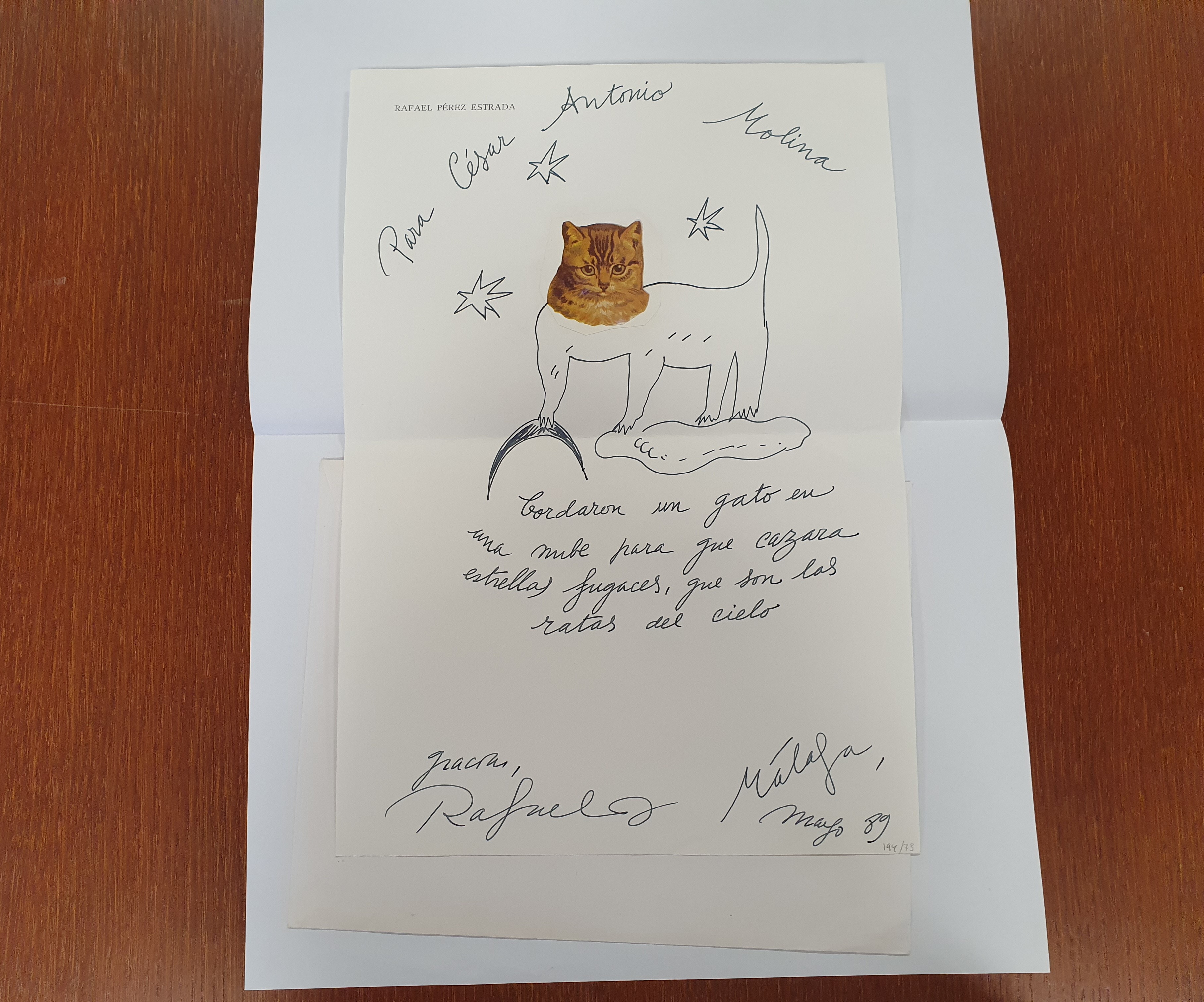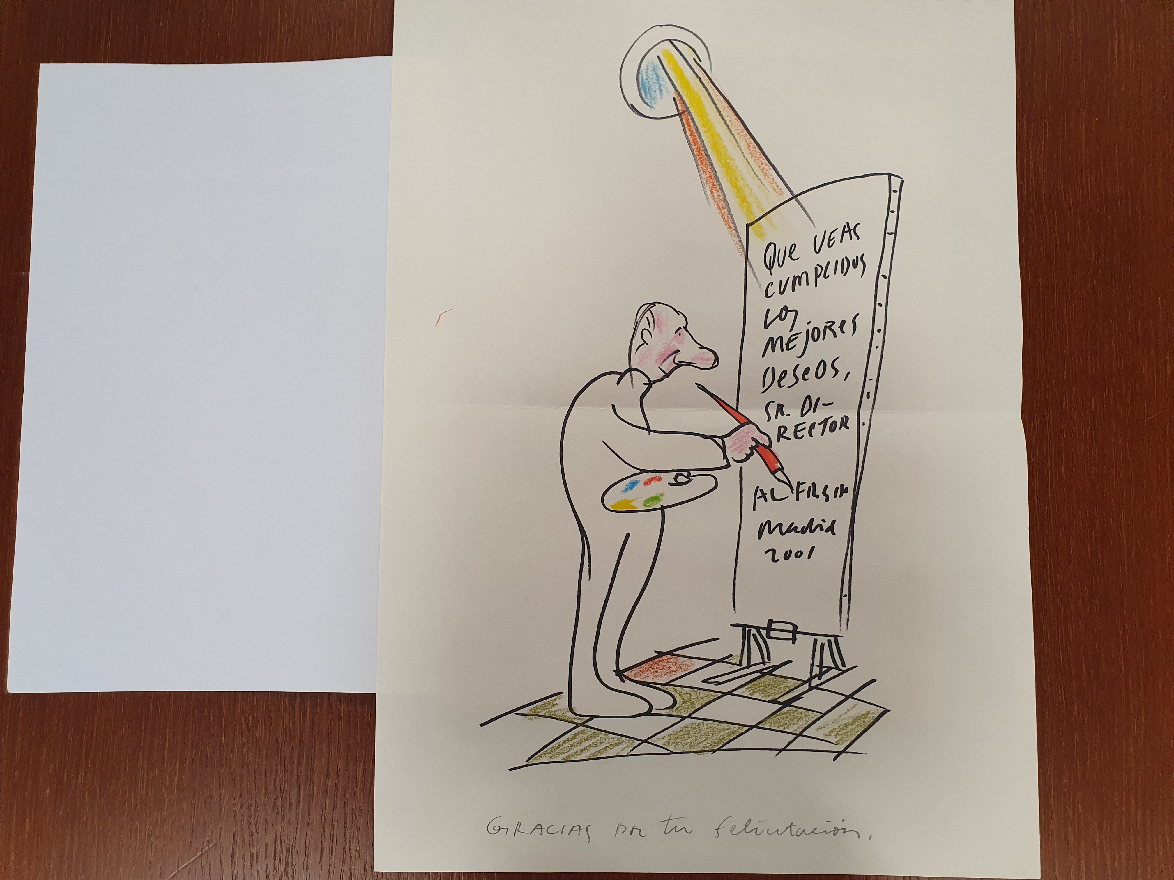 Entre os documentos de arquivo tamén imos atopar debuxos e pinturas orixinais de artistas (felicitacións do Nadal, cartas ilustradas, etc.) e tamén material tridimensional asociado a premios de diversas institucións: premios, condecoracións e medallas recibidos.
