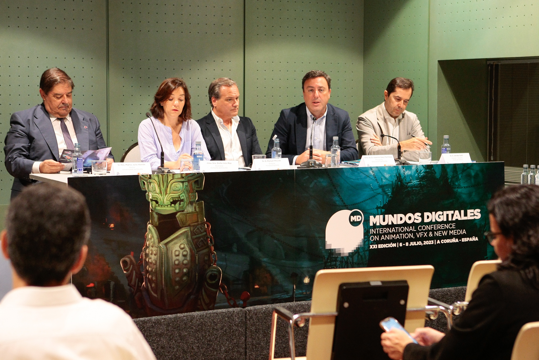 O presidente da Deputación da Coruña, Valentín González Formoso, participou hoxe en Palexco na xornada de presentación do XXI Congreso internacional de animación, efectos visuais e novos media de Mundos Digitales, xunto con Julio Abalde, reitor da Universidade da Coruña; Inés Rey, alcaldesa da Coruña; Jacobo Sutil director de AGADIC, e Manuel Meijide, director de Mundos Digitales.