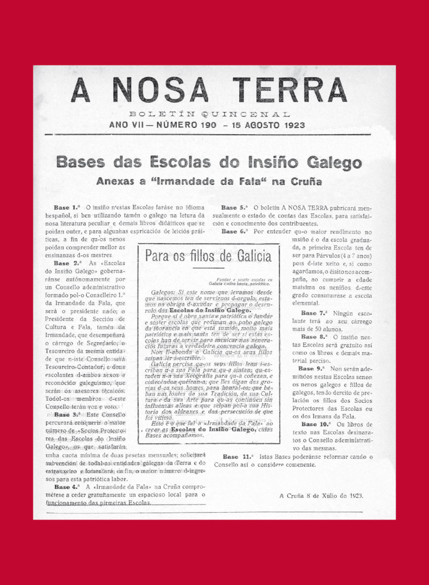 Nesa data, a Irmandade da Fala da Coruña impulsaba un dos seus principais proxectos de futuro para Galiza, as Escolas do Insiño Galego. No baixo do número 17 da Praza de María Pita, sede da asociación, firmábanse as bases dun plan educativo asentado en estudos e traballos previos, coma os do pedagogo pioneiro Xohán Vicente Viqueira, Vicente Risco, Victoriano Taibo e o editor e político Ánxel Casal, principal impulsor e alma do proxecto.