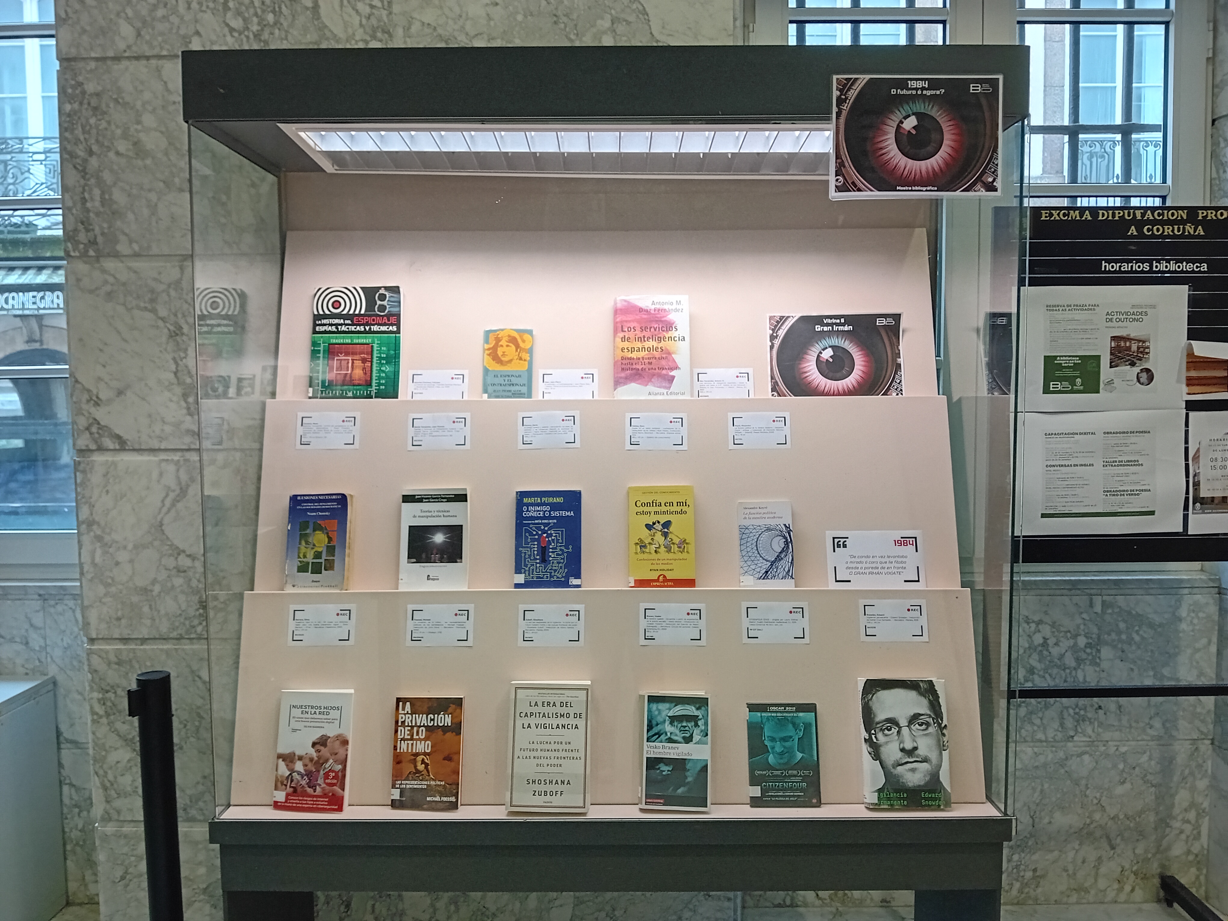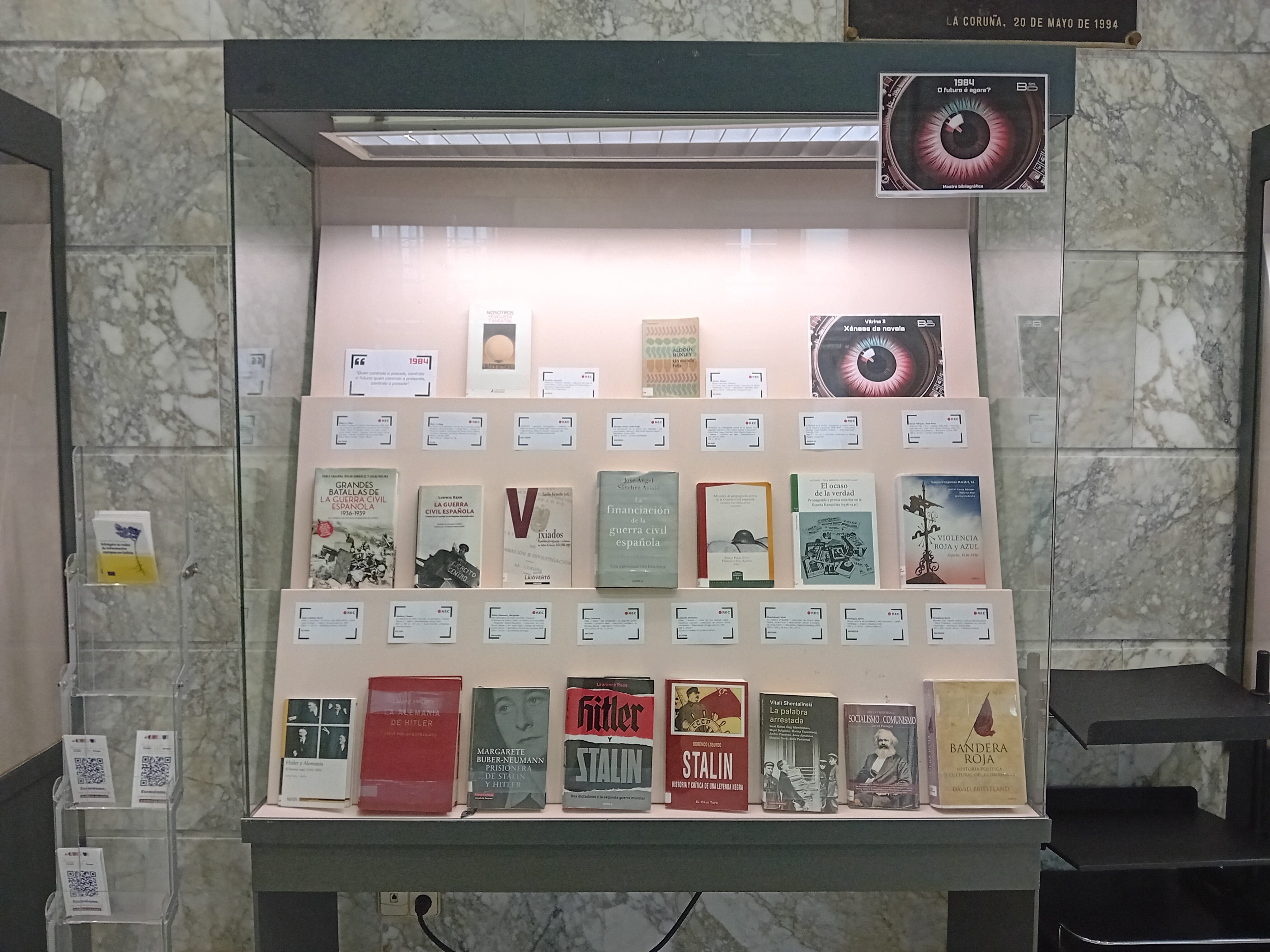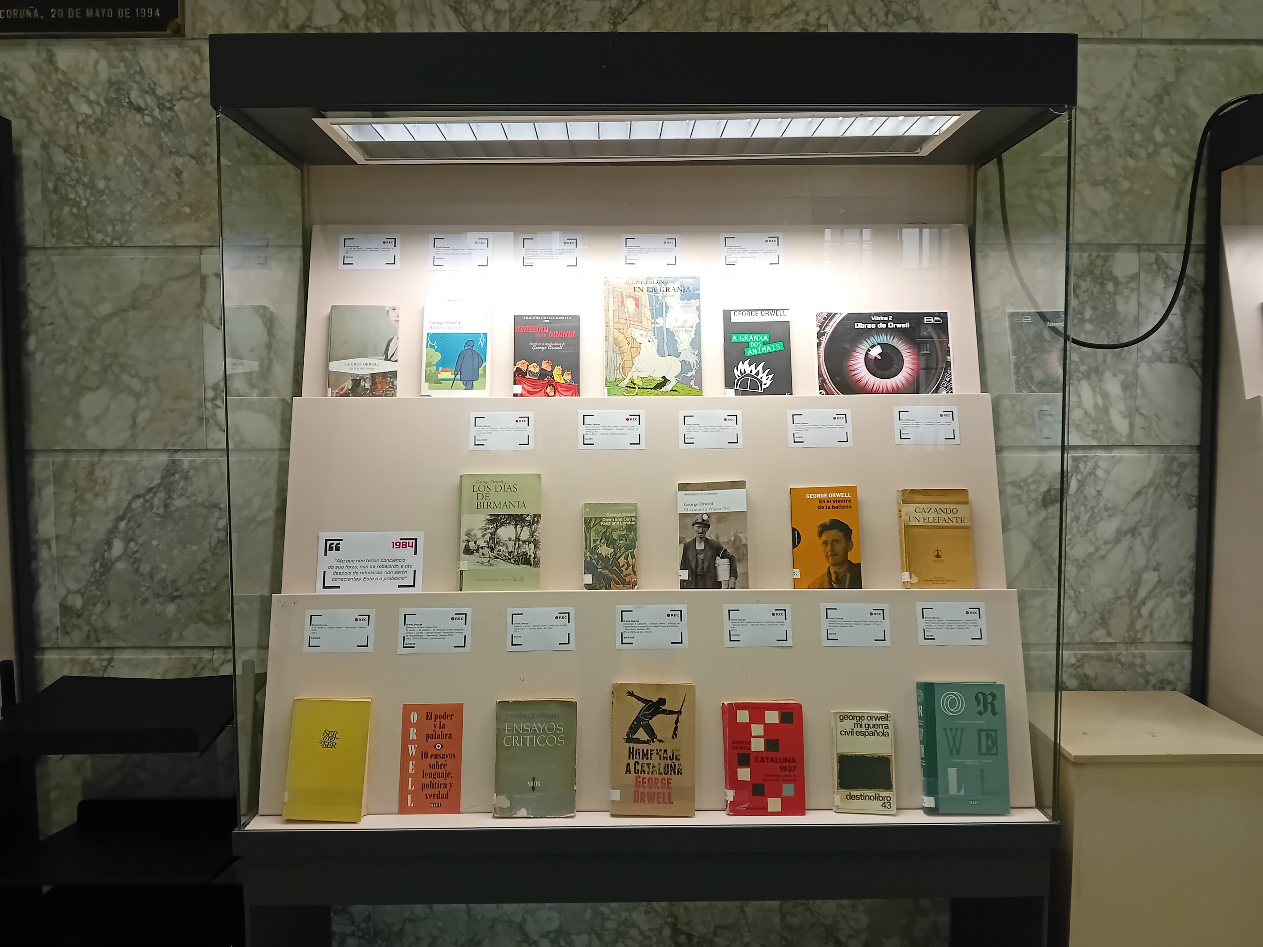 • a vitrina 2 amosa unha escolla dos escritos de Orwell e das súas adaptacións, cos que contan as coleccións da Biblioteca Provincial.