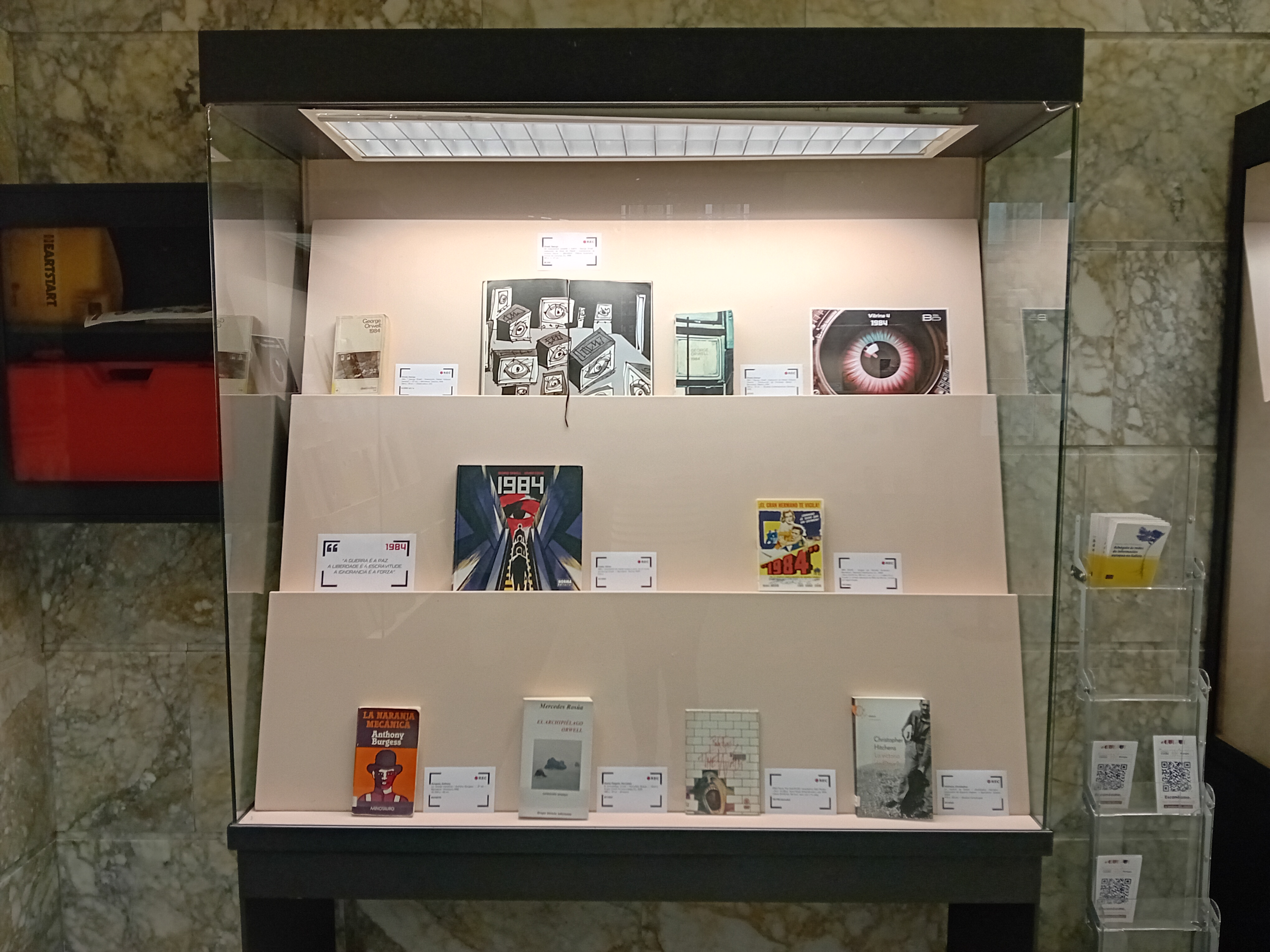 • a vitrina 4 céntrase na propia distopía, exhibindo diferentes edicións e adaptacións da mesma, xunto con creacións doutras autorías que se viron influenciadas por Orwell ou 1984.