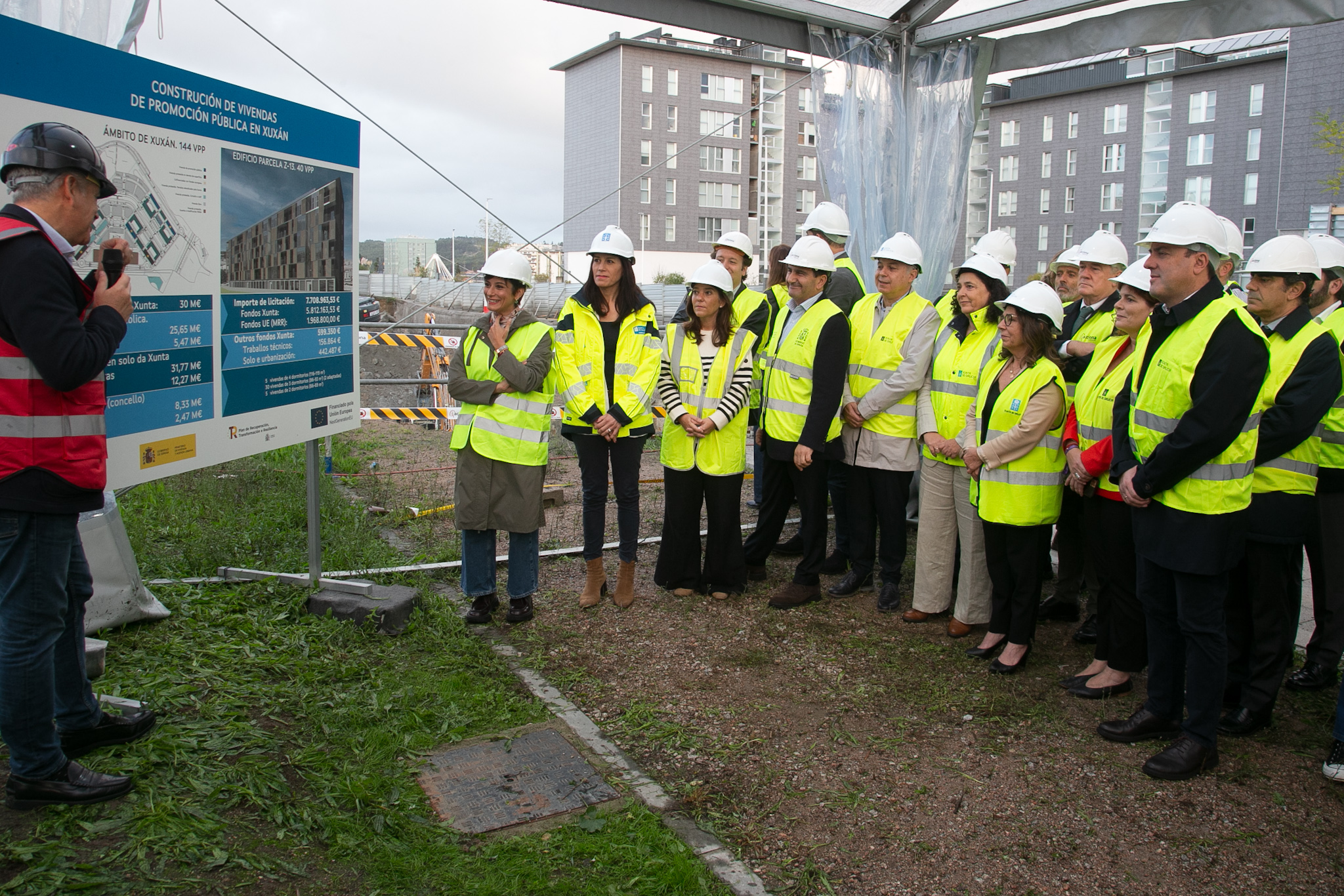 As 40 vivendas que se están a construír en Xuxán supoñen un investimento de 7,7 millóns de euros dos que case 2 millóns son financiados con fondos do Plan de Recuperación do Goberno de España- Next Generation EU. O prazo de construción é de 20 meses polo que se prevé que podan estar rematadas no verán de 2026.