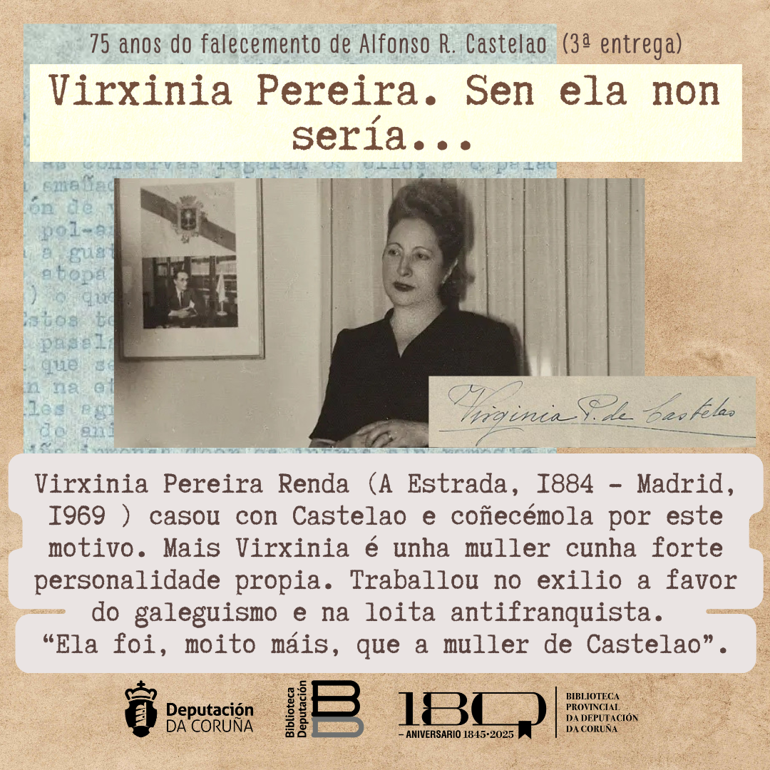 Castelao foi un traballador incansable por Galiza, pero é difícil pensar que o irrepetible legado que nos agasallou chegase a nós do mesmo xeito sen a determinación, axuda e salvagarda  que fixo deste a súa dona Virxinia Pereira Renda. Estamos a referirnos non só aos coidados físicos que precisase a saúde de Castelao ou o coidado do seu fillo Afonso, se non tamén ao traballo que a estradense desenvolveu por toda Europa e América espallando e defendendo os postulados republicanos e antifascistas, así como o Estatuto de Galicia e un futuro político para o país, durante a vida de Alfonso R. Castelao, e alén dela.