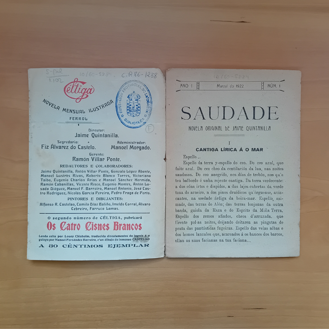 O primeiro número publicado na colección Céltiga é Saudade, unha novela escrita polo propio Xaime Quintanilla, de prosa poética e temática costumista. A imaxe da portada pertence a un óleo do pintor ferrolán Imeldo Corral, un artista no que a paisaxe e natureza galegas son temas fundamentais.