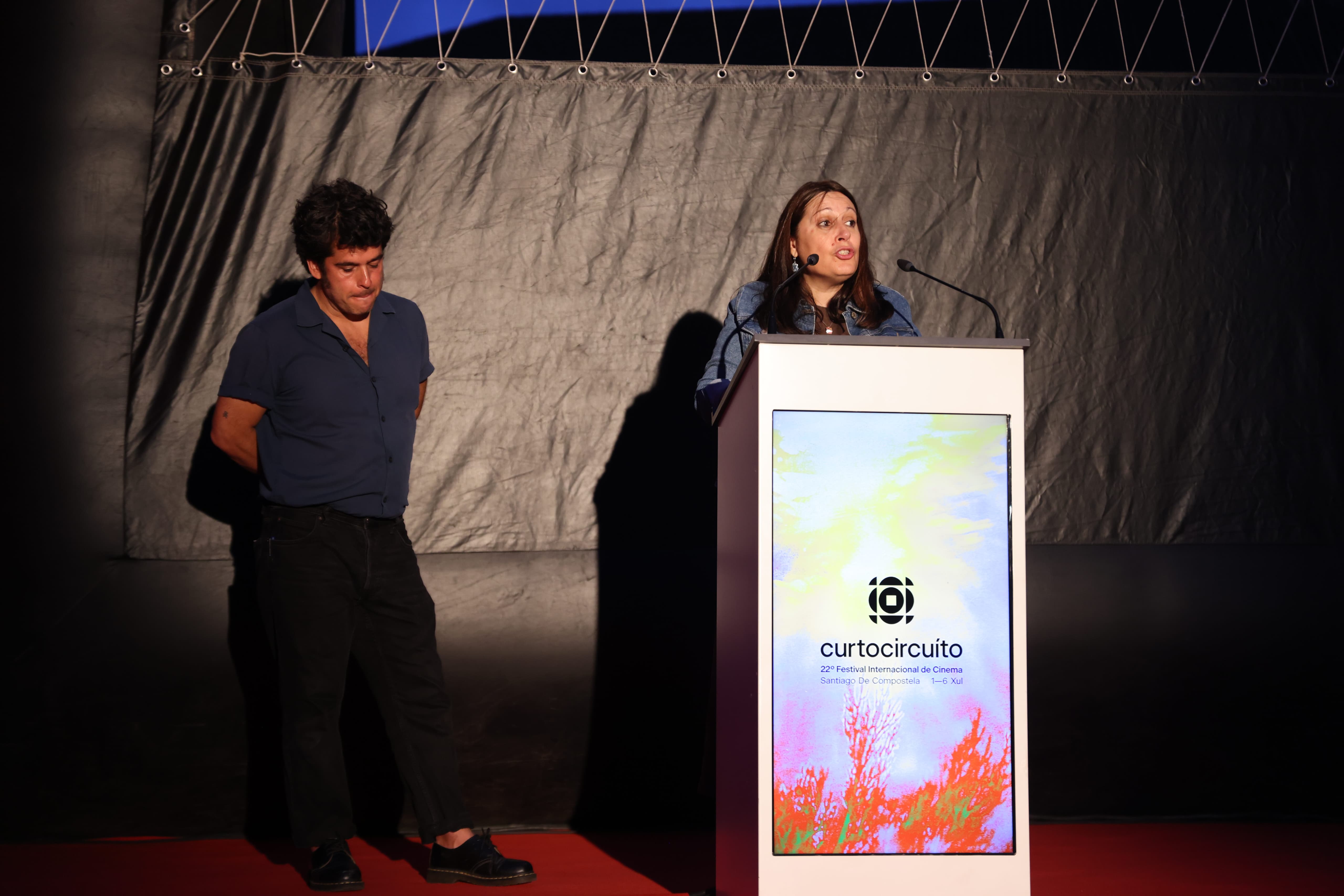 A praza da Quintana acolleu onte a apertura da 22ª edición do Curtocircuíto coa estrea de 'Ariel', de Lois Patiño, "un festival que se ten consolidado como un espazo singular dentro do panorama audiovisual, tanto galego como internacional", tal e como sinalou a deputada de cultura, Natividade González, que asistiu á inauguración, acompañada da alcaldesa de Santiago, Goretti Sanmartín; do director do festival, Pela del Álamo, da produtora do filme Beli Martínez, do director da Axencia Galega das Industrias Culturais, Jacobo Sutil; da actriz protagonista Irene Escolar e do propio Lois Patiño.
