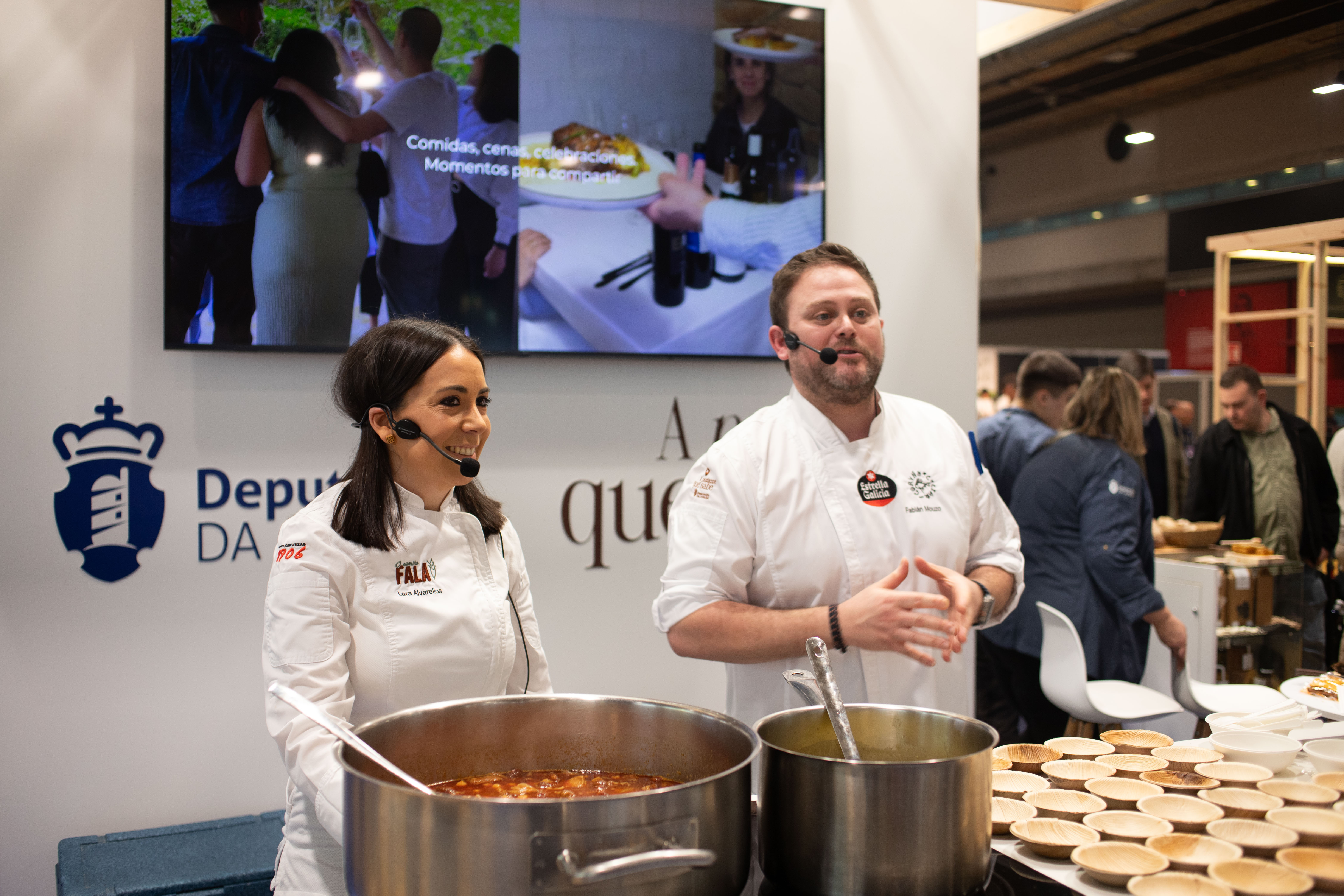 A cociña en directo tivo un papel central coa dobre participación de Fabián Mouzo e Lara Alvarellos, do restaurante O Camiño Fala de Mazaricos, que elaborou callos ao estilo de Carnés e albóndegas de atún en salsa verde. Na primeira das súas demostracións, as longa ringleira de persoas dispostas a probar o prato acabaron en poucos minutos coas racións dispoñíbeis.