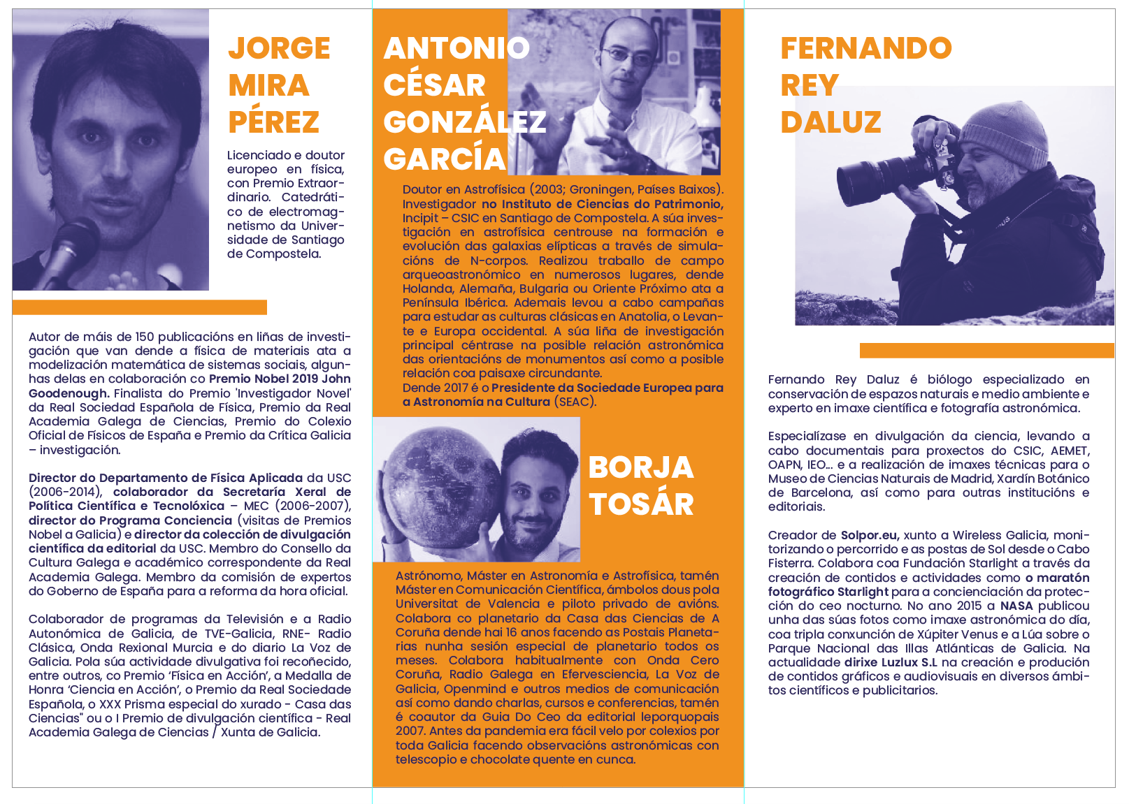 Astrónomo, Máster en Astronomia e Astrofíslca, tamén Máster en Comunicación Cientifica, ámbolos dous pola Unlversitat de Valencla e piloto privado de avións. Colabora co planetario da casa das Ciencias de A Coruna dende hai 16 anos facendo as Postais Planetarias nunha sesión especial de planetario todos os meses. Colabora habitualmente con Onda Cero Coruña, Radio Galega en Efervesciencia, La Voz de Gallcla, Openmind e outros medlos de comunicación así como dando charlas, cursos e conferencias, tamén é coautor da Guía Do Ceo da editorial leporquopais 2007. Antes da pandemla era fácll velo por colexios por toda Gallcla facendo observacións astronómlcas con telescopio e chocolate quente en cunca.