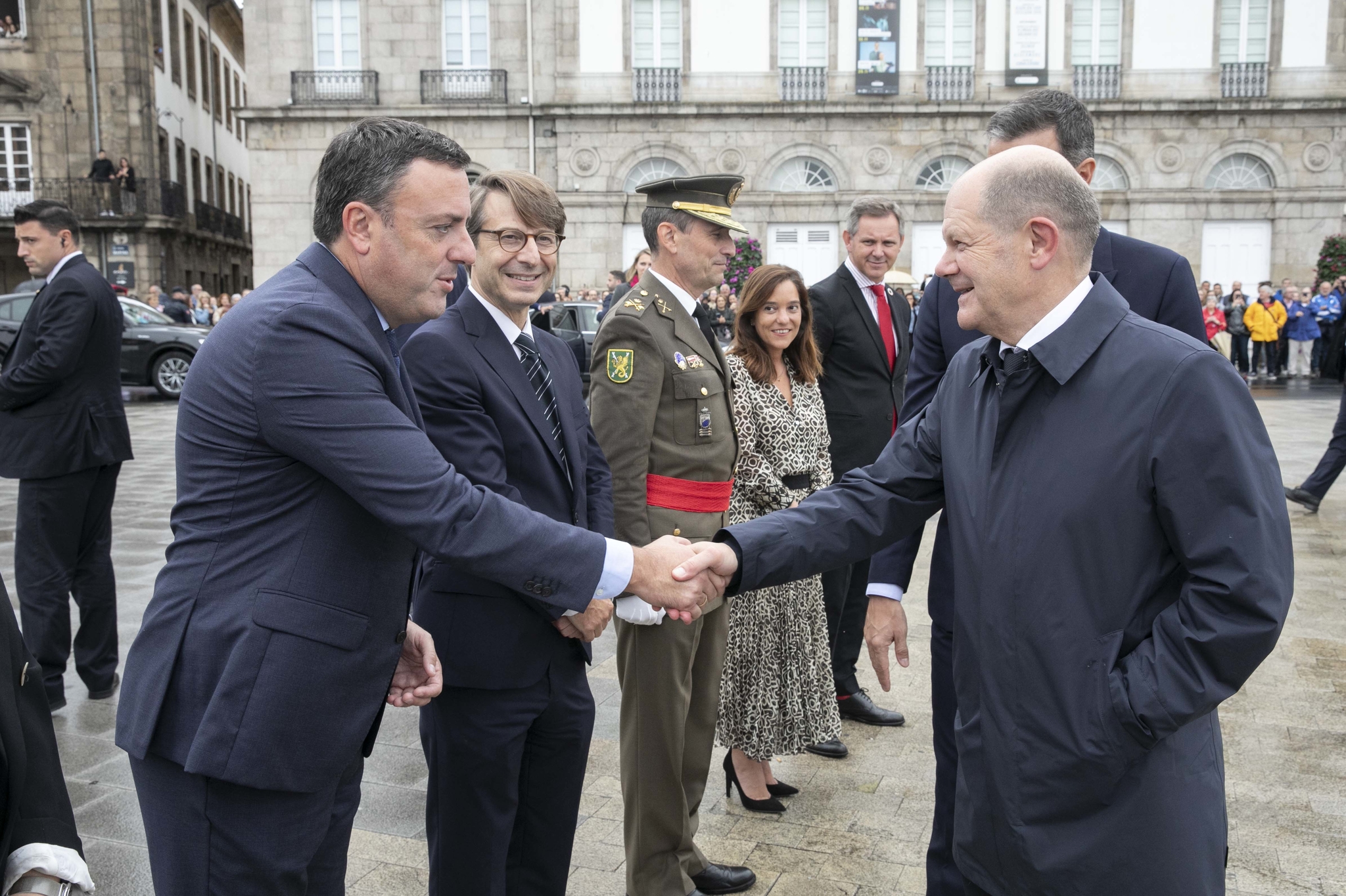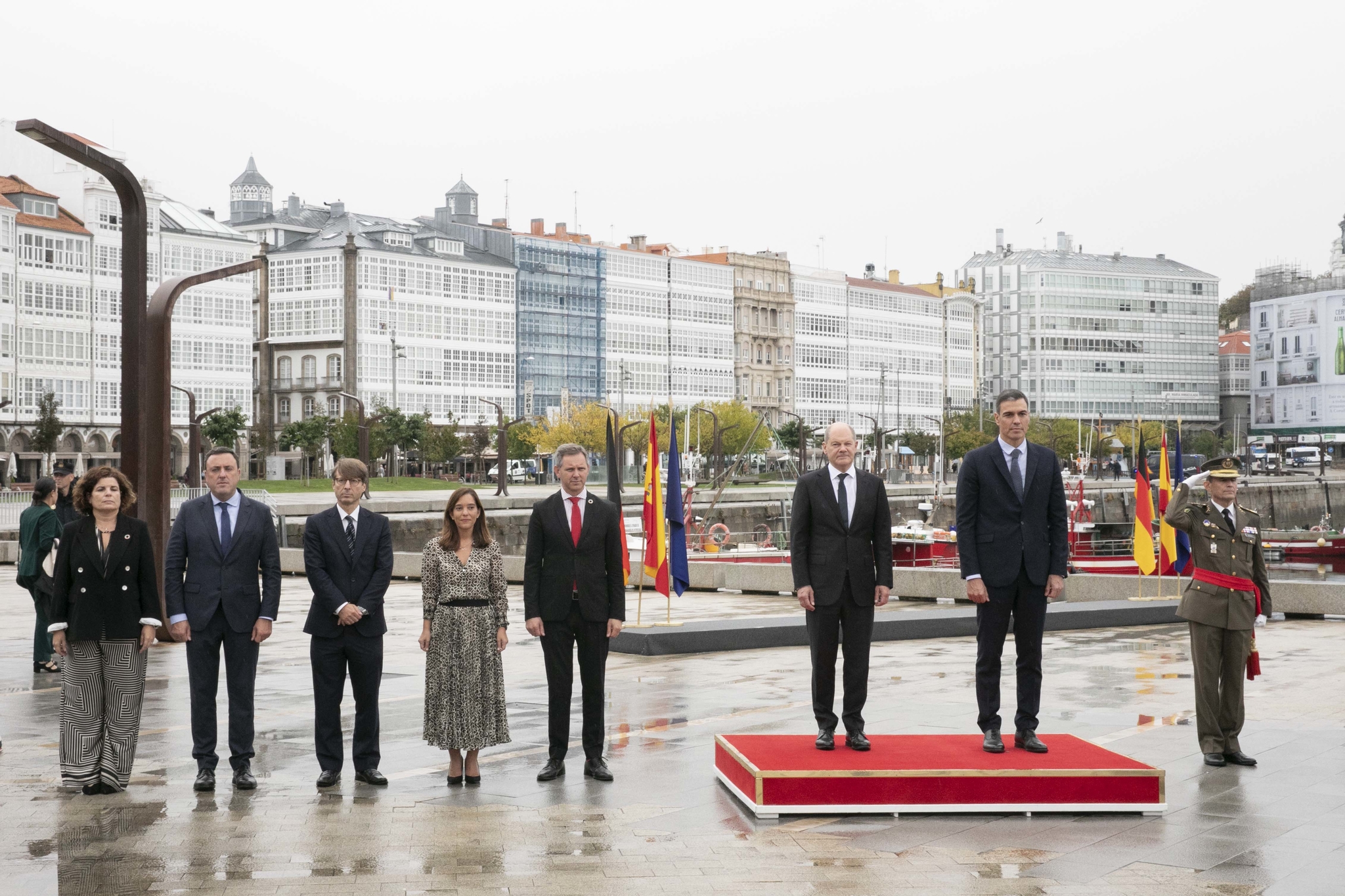 Scholz está acompañado polo vicechanceler e ministro de Economía, Robert Habeck; o ministro de Finanzas, Christian Lindner; a ministra de Exteriores, Annalena Baerboc; a ministra de Defensa, Christine Lambrecht, o ministro de Traballo, Hubertus Heil; a ministra de Investigación e Ciencia, Bettina Stark-Wanzinger, e o ministro de Agricultura, Cem Özdemir