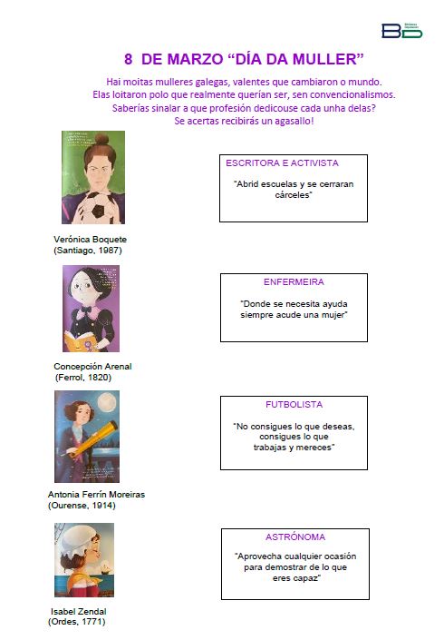 Hai moitas mulleres galegas, valentes, que cambiaron o mundo. Elas loitaron polo que realmente querían ser, sen convencionalismos. Saberías sinalar a que profesión se dedicou cada unha delas? Se acertas recibirás un agasallo! 8M Xogo Xuvenil