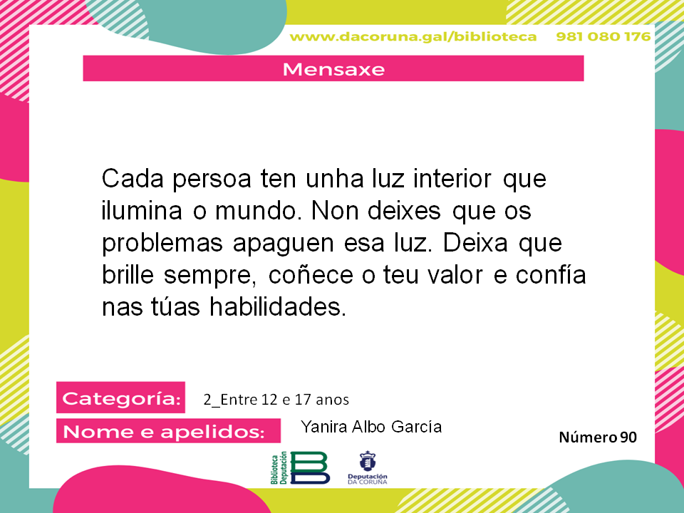 "Cada persoa ten unha luz interior que ilumina o mundo. Non deixes que os problemas apaguen esa luz. Deixa que brille sempre, coñece o teu valor e confía nas túas habilidades."