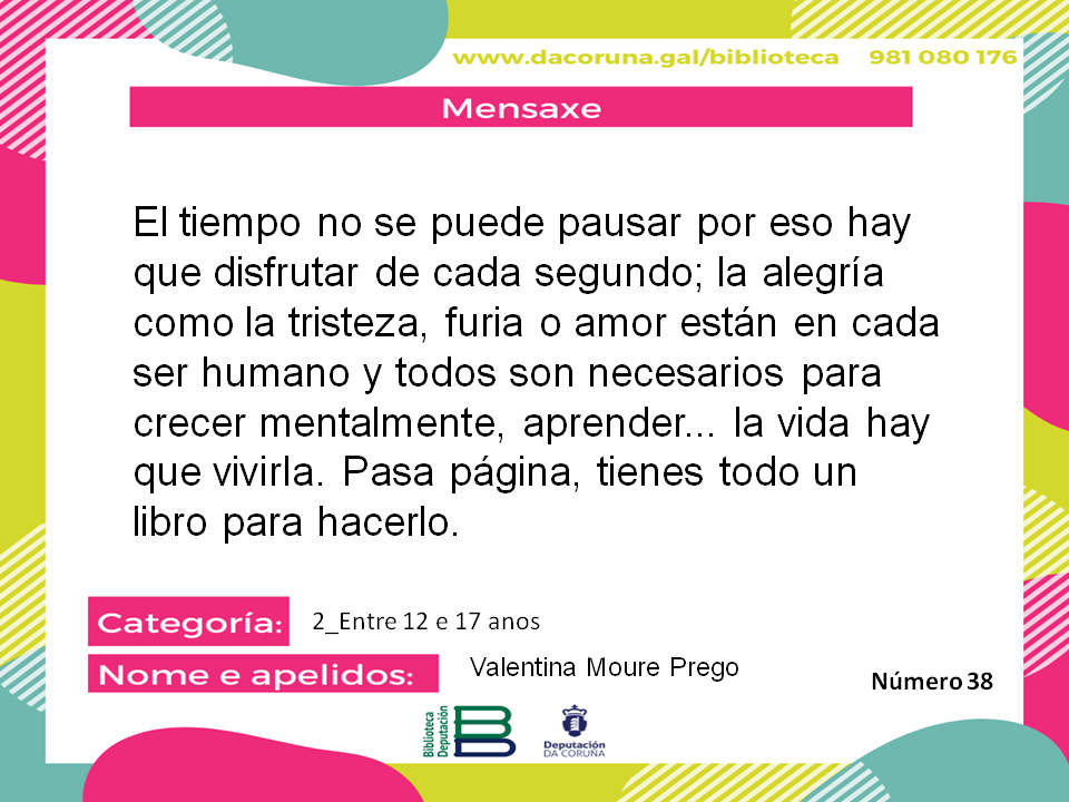 "El tiempo no se puede pausar por eso hay que disfrutar de cada segundo; la alegría como la tristeza, furia o amor están en cada ser humano y todos son necesarios para crecer mentalmente, aprender... la vida hay que vivirla. Pasa página, tienes todo un libro para hacerlo."