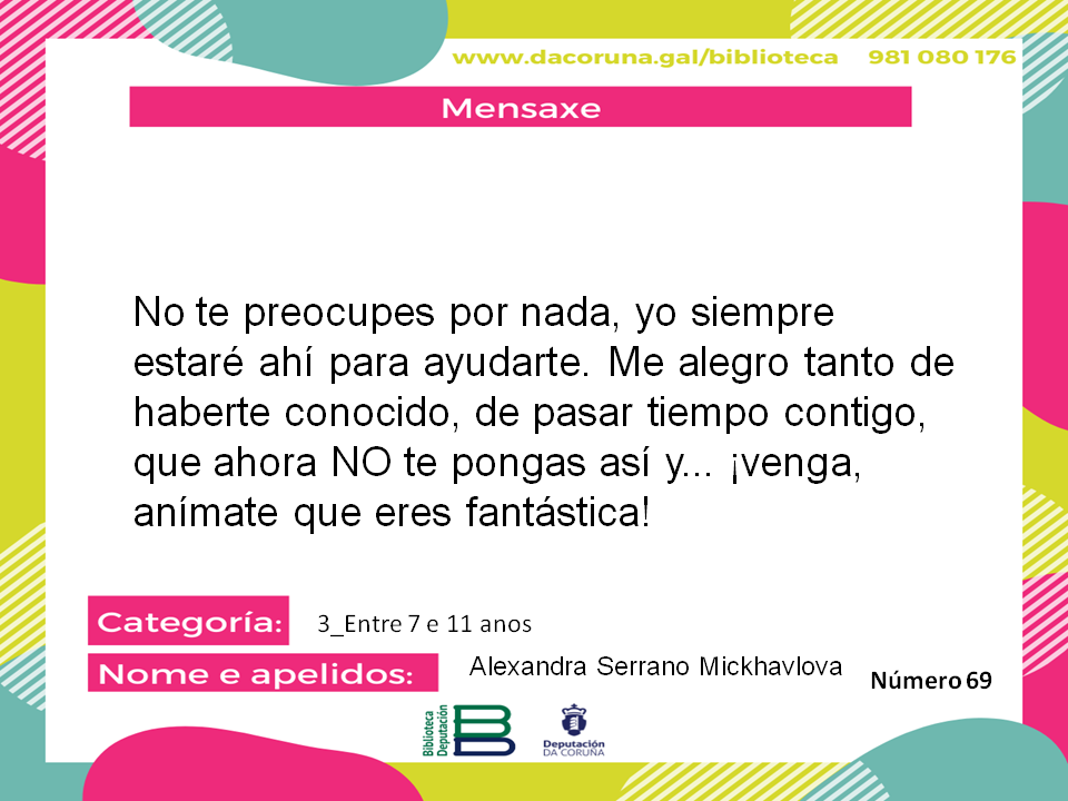 "No te preocupes por nada, yo siempre estaré ahí para ayudarte. Me alegro tanto de haberte conocido, de pasar tiempo contigo, que ahora NO te pongas así y... ¡venga, anímate que eres fantástica!"