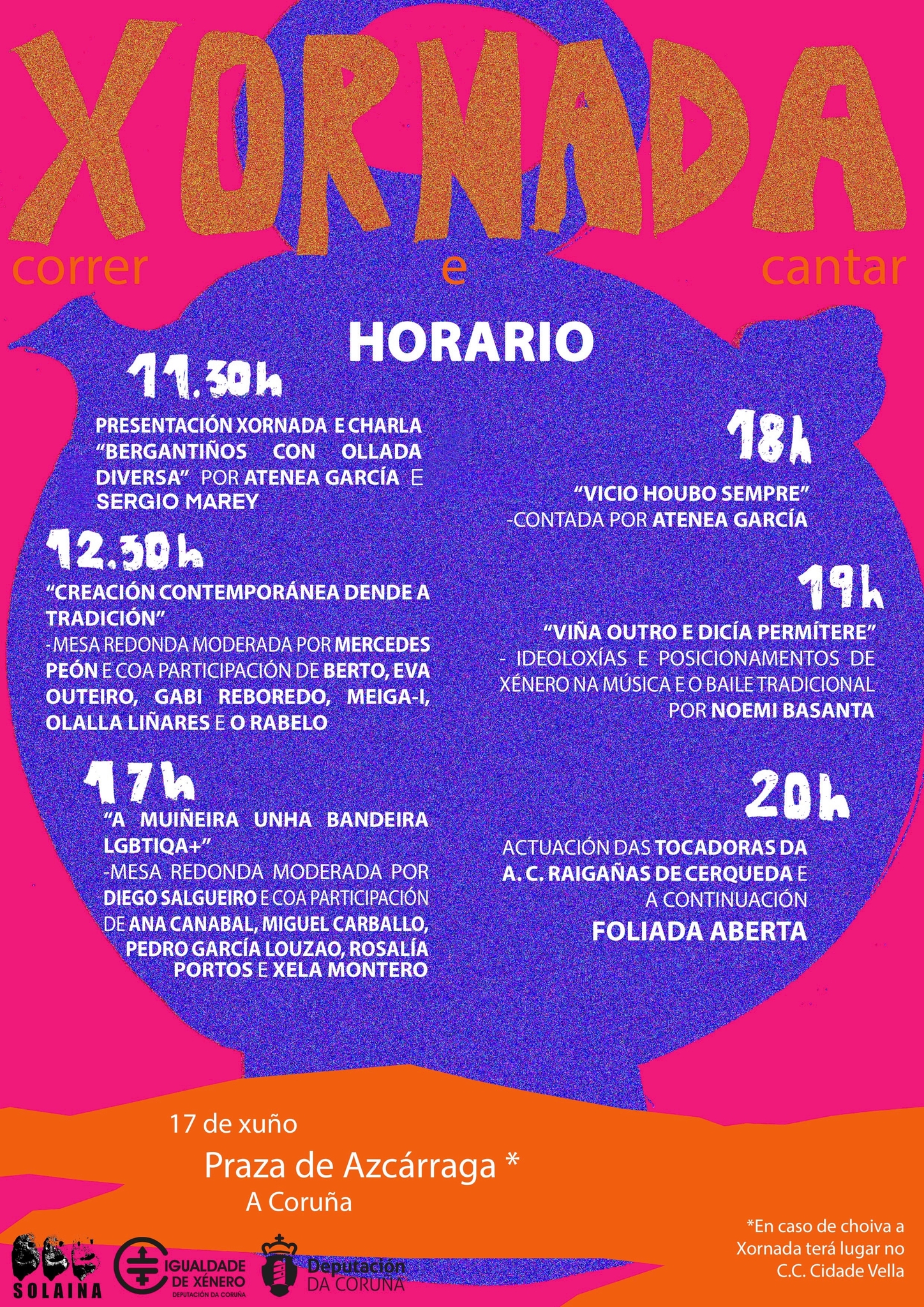 O día continuará cunha mesa redonda, Creación contemporánea dende a tradición, moderada por Mercedes Peón e que contará con artistas como Berto, Meiga-i, Eva Outeiro de Toma a Terra, Gabi Reboredo, O Rabelo e Olalla Liñares de Oîma. A tarde comezará do mesmo xeito, cunha mesa redonda, A muiñeira, unha bandeira LGBTIQA+, moderada por Diego Salgueiro (integrante do Orgullo Crítico de Nigrán, bailador e tocador) que contará con diferentes persoas do colectivo vinculadas á música tradicional e o rural que falarán da súa experiencia e realidade como persoas LGBTIQA+ nestes ámbitos. A continuación, terá lugar unha contada para adultos de Atenea García, titulada Vicio houbo sempre, á que seguirá Noemi Basanta, integrante das Adufeiras de Salitre e Doutora en Filoloxía Galega, falando das ideoloxías e posicionamentos de xénero no baile e a música tradicionais galegas. O broche final desta xornada será a actuación das Tocadoras da A.C. Raigañas de Cerqueda, que cantarán coplas de temática LGBTIQA+ dun libro que sairá máis adiante deste proxecto, e serán as encargadas de abrir a foliada que concluirá o día e celebrará a tolerancia e a igualdade das persoas, independentemente da súa orientación sexual e identidade de xénero.