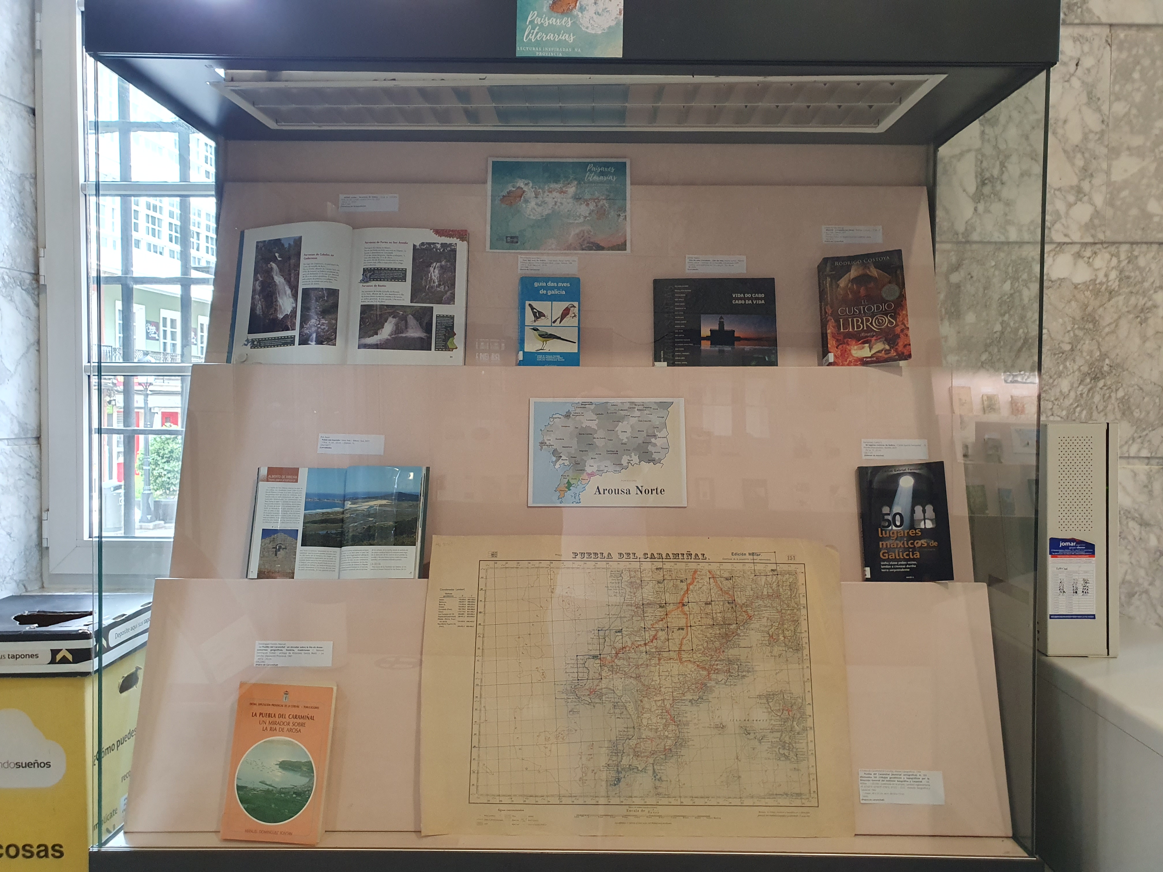 Mostra bibliográfica dispoñible no vestíbulo da Biblioteca sobre literatura ambientada na provincia da Coruña.