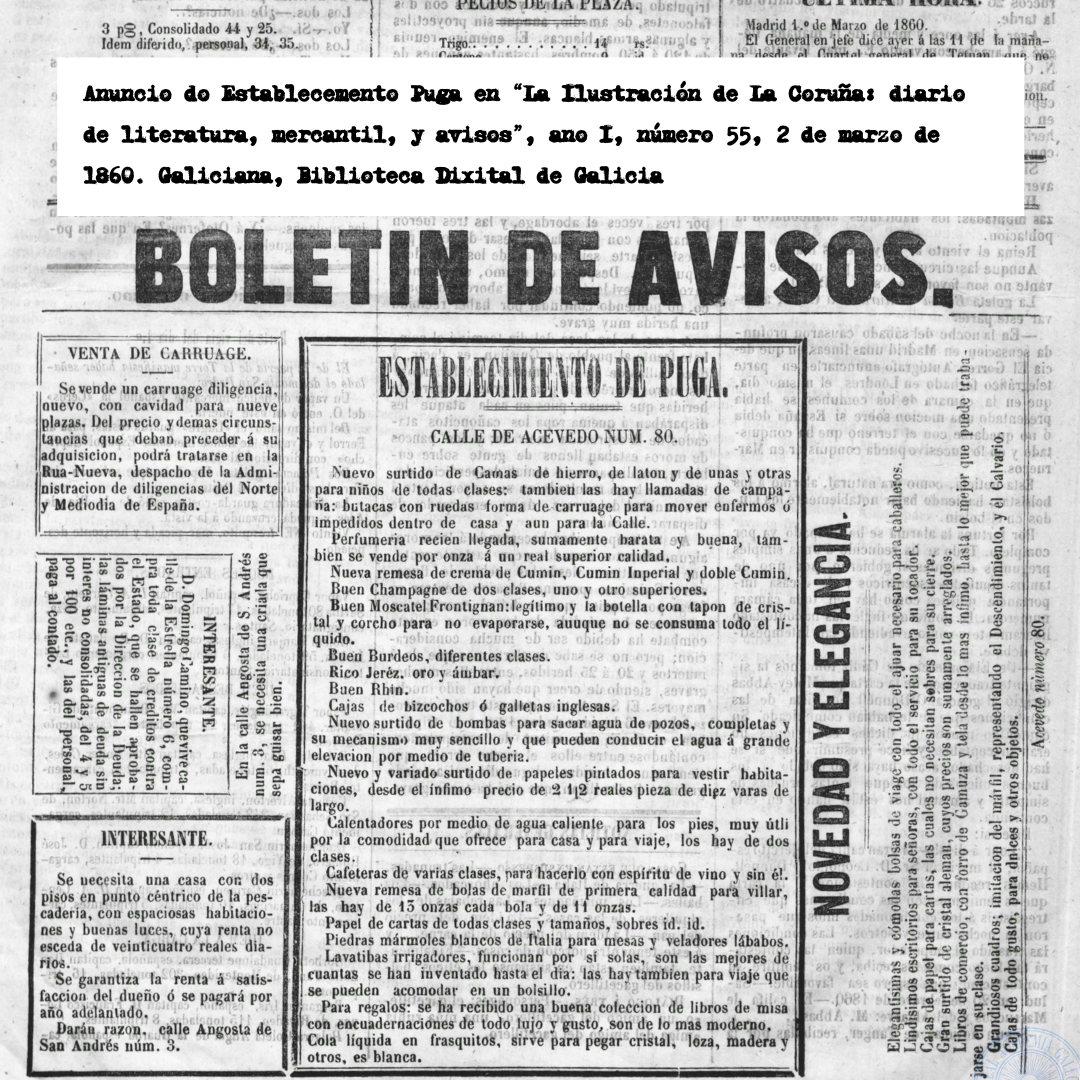 O pouco que sabemos desta imprenta coruñesa é que o seu dono -o impresor e editor Domingo Puga- era orixinario de Padrón e que se trasladou a Coruña onde abriu unha librería na que, máis tarde, incorporaría unha imprenta e unha litografía. Tal como aparece anunciada na prensa da época, temos que pensar nun negocio máis ben xeneralista, onde podías mercar un Burdeos, algún xeado e un bo libro!