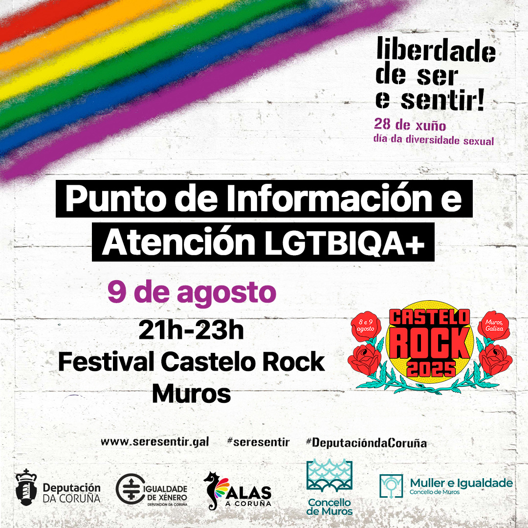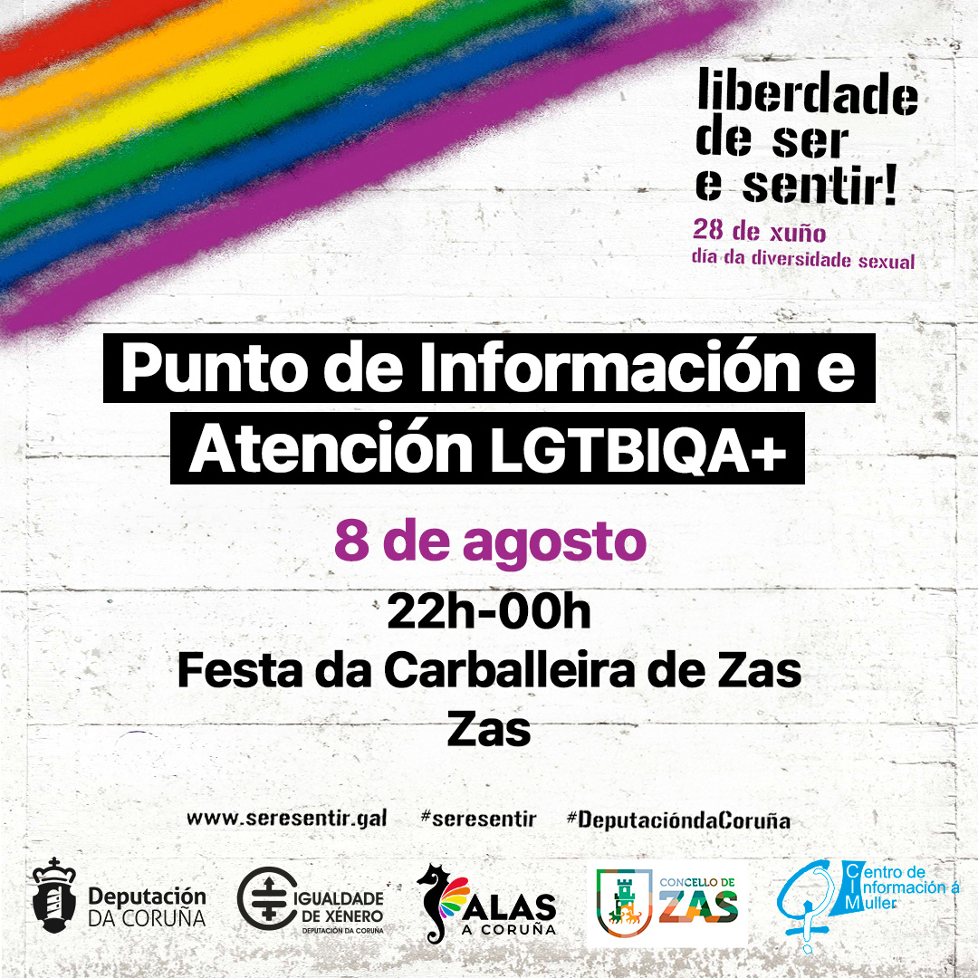 A asociación LGTBI+ ALAS A Coruña poñerá en marcha un total de oito puntos informativos en festivais e festas populares da provincia, ao abeiro da campaña Liberdade de Ser e Sentir, impulsada ao longo de todo o ano polo departamento de Igualdade e Dereitos Civís da Deputación da Coruña para a defensa dos dereitos da comunidade LGTBI+. A primeira das citas na que se instalarán os puntos é, mañá mesmo, a Carballeira de Zas.