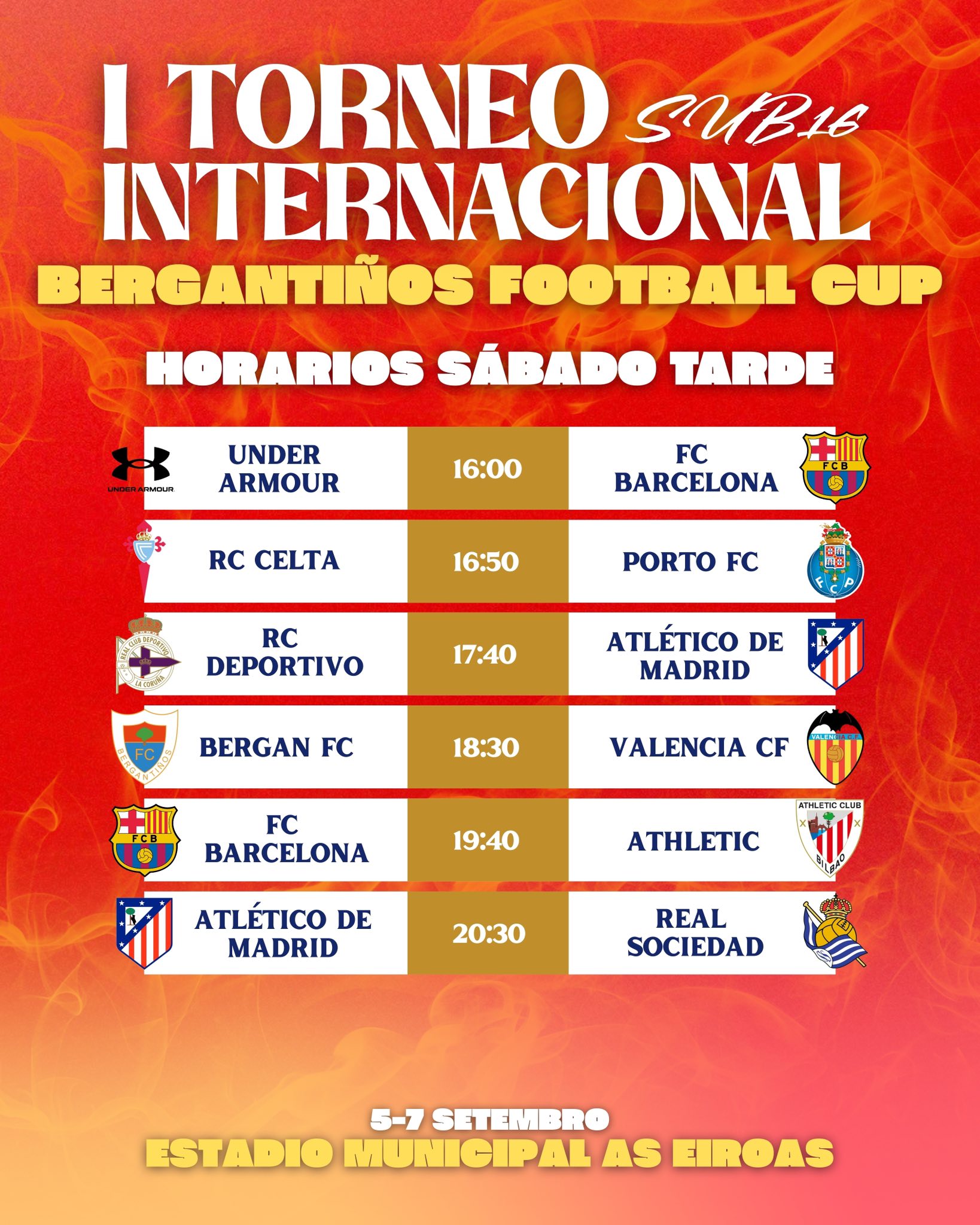 Bergantiños, Celta, Deportivo, Barcelona, Atlético de Madrid, Porto, Athletic Club, Valencia, Real Sociedad e o combinado xaponés Next Japan Under Armour competirán polo trofeo do 5 ao 7 de setembro no campo carballés das Eiroas
