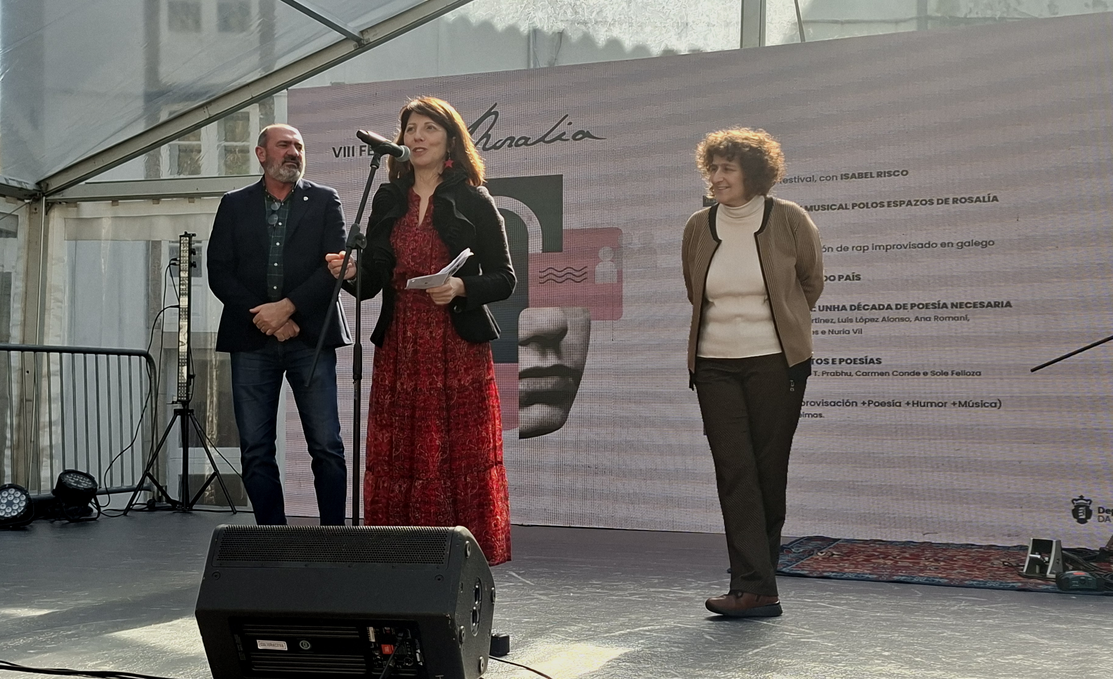 O Festival Rosalía, organizado pola Deputación da Coruña en colaboración co Concello de Santiago de Compostela, botou a andar hoxe na súa oitava edición. «Este festival non só reivindica a figura de Rosalía, senón que socializa o seu legado», salientou na inauguración oficial deste encontro a deputada de Igualdade, Lingua e Dereitos Civís da Deputación da Coruña, Sol Agra. Na súa intervención tamén puxo en valor a pegada histórica da autora de Follas novas nos ámbitos da lingua, do feminismo e mesmo da ecoloxía. Neste último punto, Agra lembrou a posición que a autora amosou no seu día fronte á tala indiscriminada na Carballeira de Conxo, aló cara a 1881.